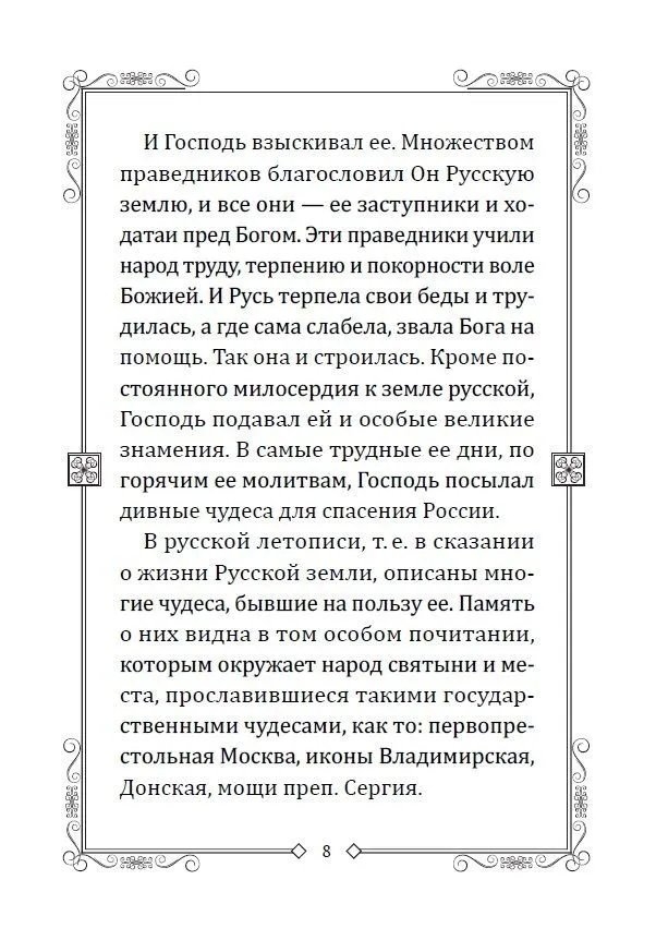 Особое внимание уделено той помощи, которую оказал преподобный Сергий Радонежский людям земли русской в трудные, переломные этапы истории России. Книга изобилует чрезвычайно интересными сведениями и подробностями, касающимися предмета её изложения. Автор начинает своё повествование с крещения Руси, проводит читателя через эпоху становления русского государства, феодальной раздробленности, татаро-монгольского нашествия, смуты начала XVII века и подводит к концу века XIX, когда над страной уже занималось зарево грядущей революции…