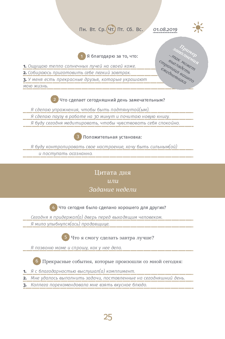 Проверенные на практике принципы позитивной психологии и нейробиологии помогут вам достичь целей, пережить трудные моменты, улучшить отношения с другими людьми и идти по жизни уверенно. С ежедневником вы сможете улучшать свою жизнь постоянно и проактивно, шаг за шагом и каждый день!