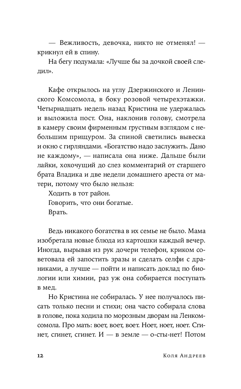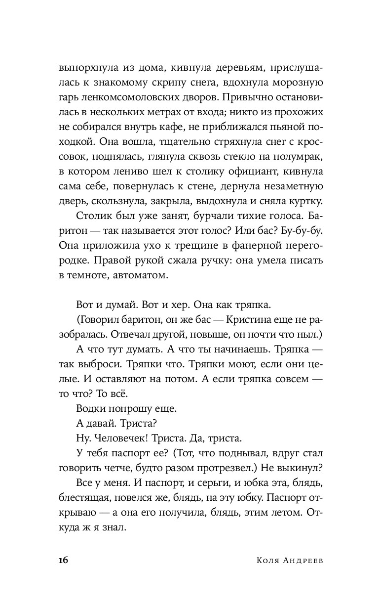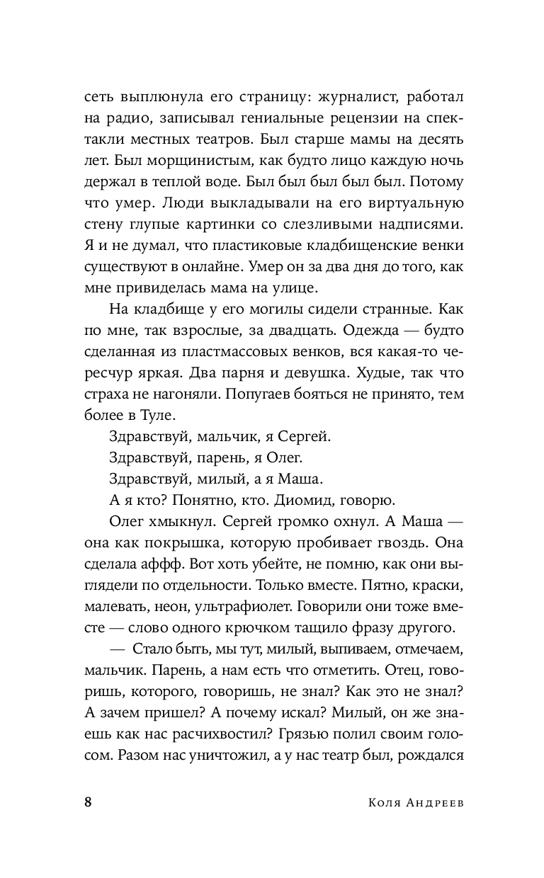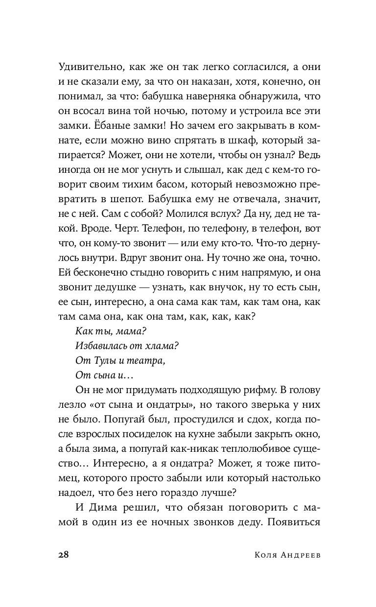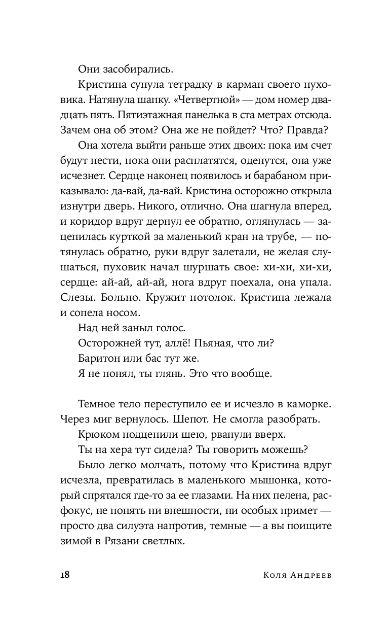 Эта притягательно тревожащая мозаика из судеб, где каждый персонаж, сам того не зная, становится частью сложноустроенного, взаимосвязанного сюжета. События разворачиваются на фоне мрачных городских пейзажей, ведут к непредсказуемым встречам, трагическим открытиям и неизбежной расплате за выбор, сделанный в пользу темной стороны. Герои пытаются вырваться из круга страданий, раз за разом проходя путь от болезненных воспоминаний детства и семейных тайн до саморазрушительных пристрастий и манипулятивных отношений. Это роман в рассказах о внутренних демонах, искаженной реальности и поиске смысла в хаосе, в котором иррациональная надежда – универсальный ответ на каждый вопрос.