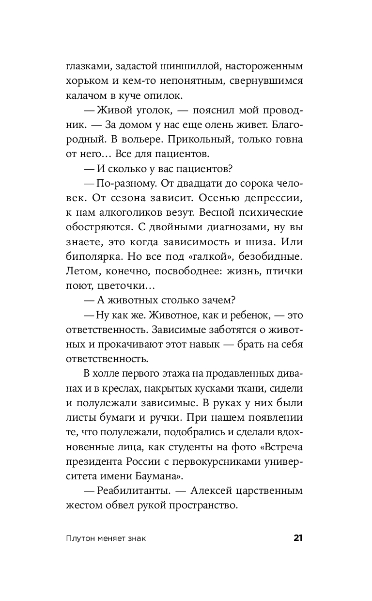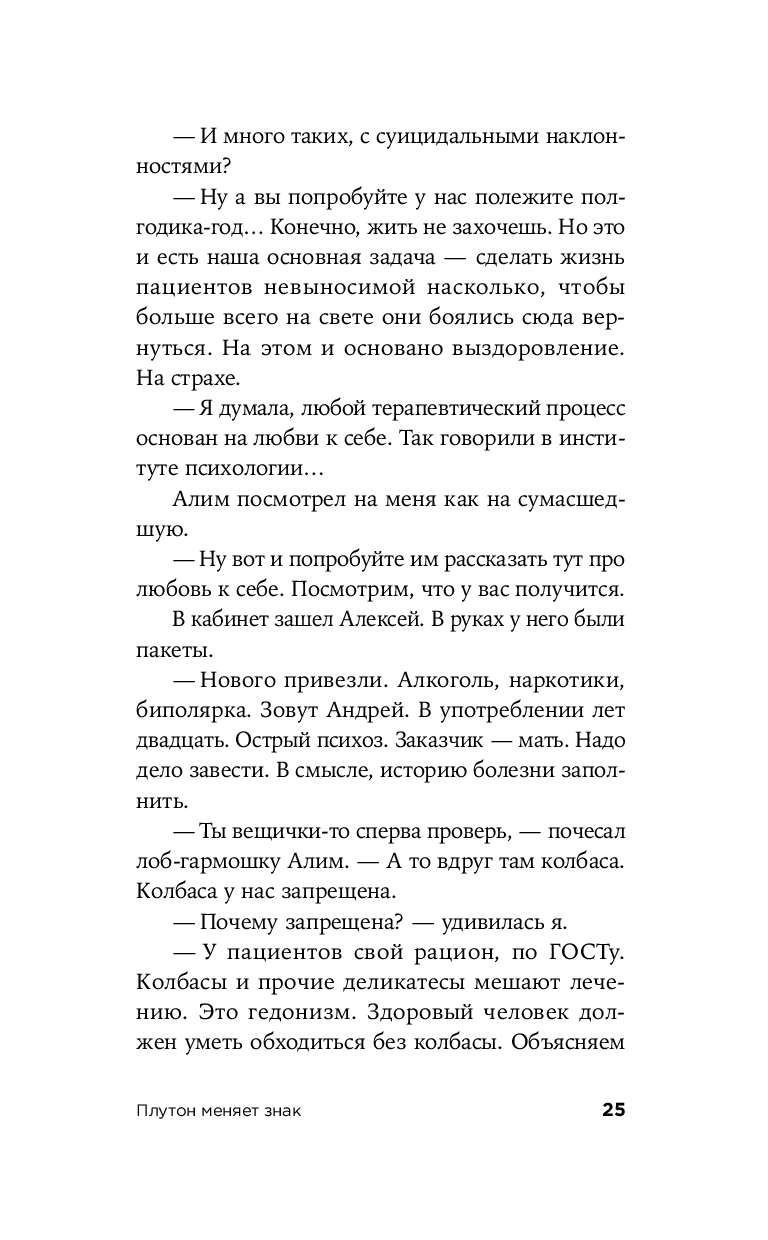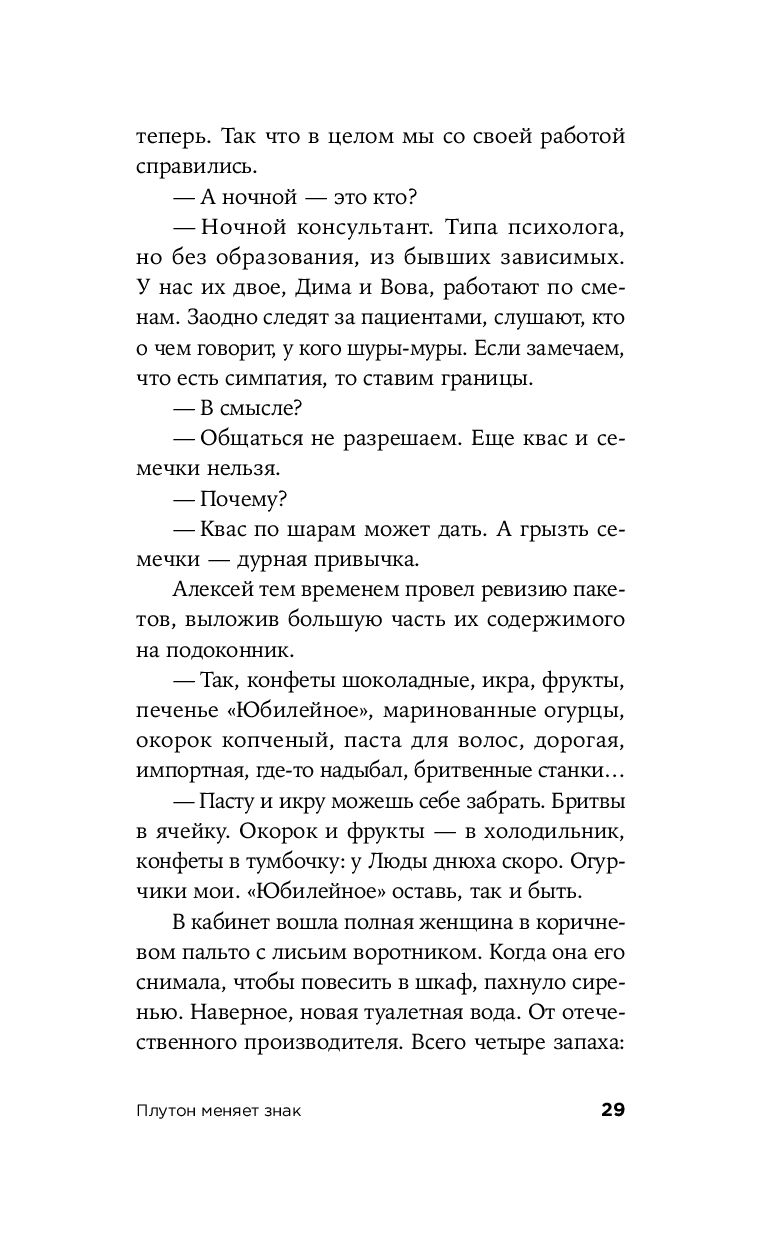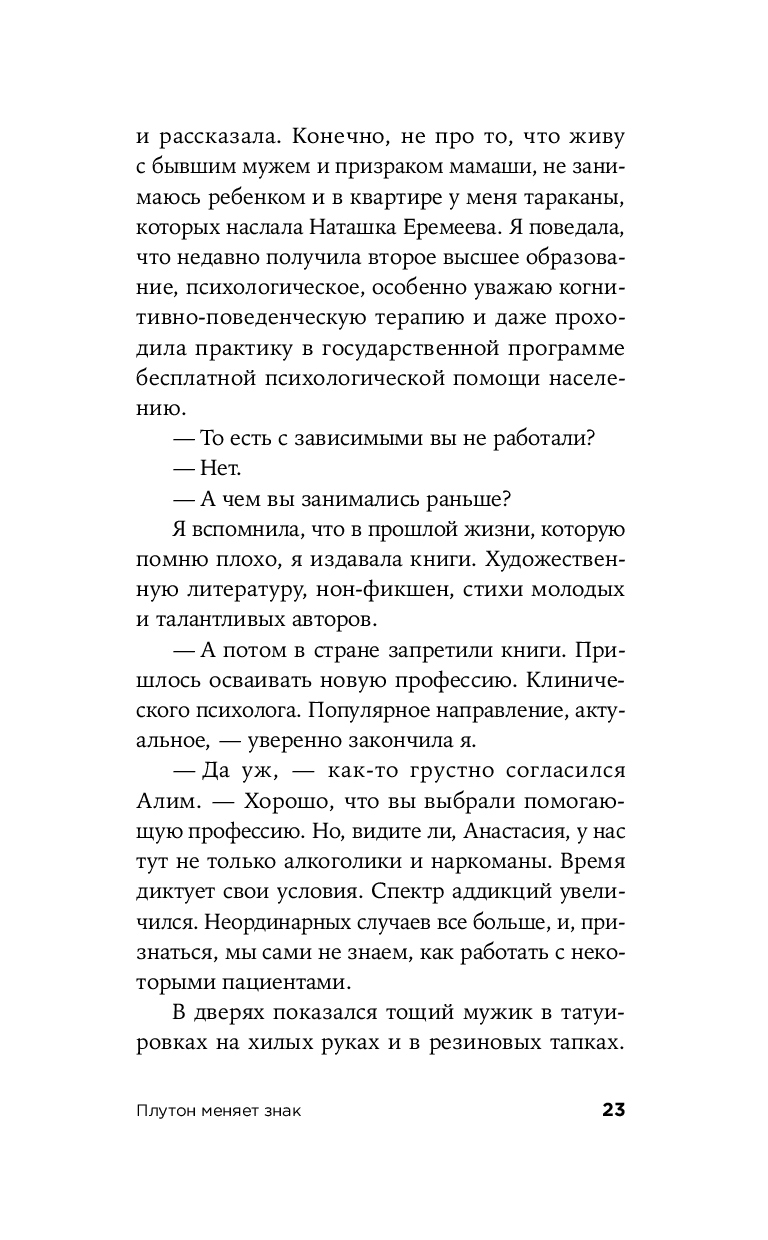 В мире, где каждый шаг регламентирован и больше нет свободного искусства, бывший издатель Анастасия становится клиническим психологом. Ее собственная реальность зыбка и сюрреалистична: в ее квартире живут бывший муж и призрак матери, ее пациенты одержимы нетривиальными зависимостями, ее окружение придает астрологии вес критической рациональности. Но даже в условиях тотального контроля налаженная система однажды дает сбой – и не только потому, что Плутон меняет знак, а значит, все неизбежно придут к всеобщей трансформации, как обещают по телевизору.
