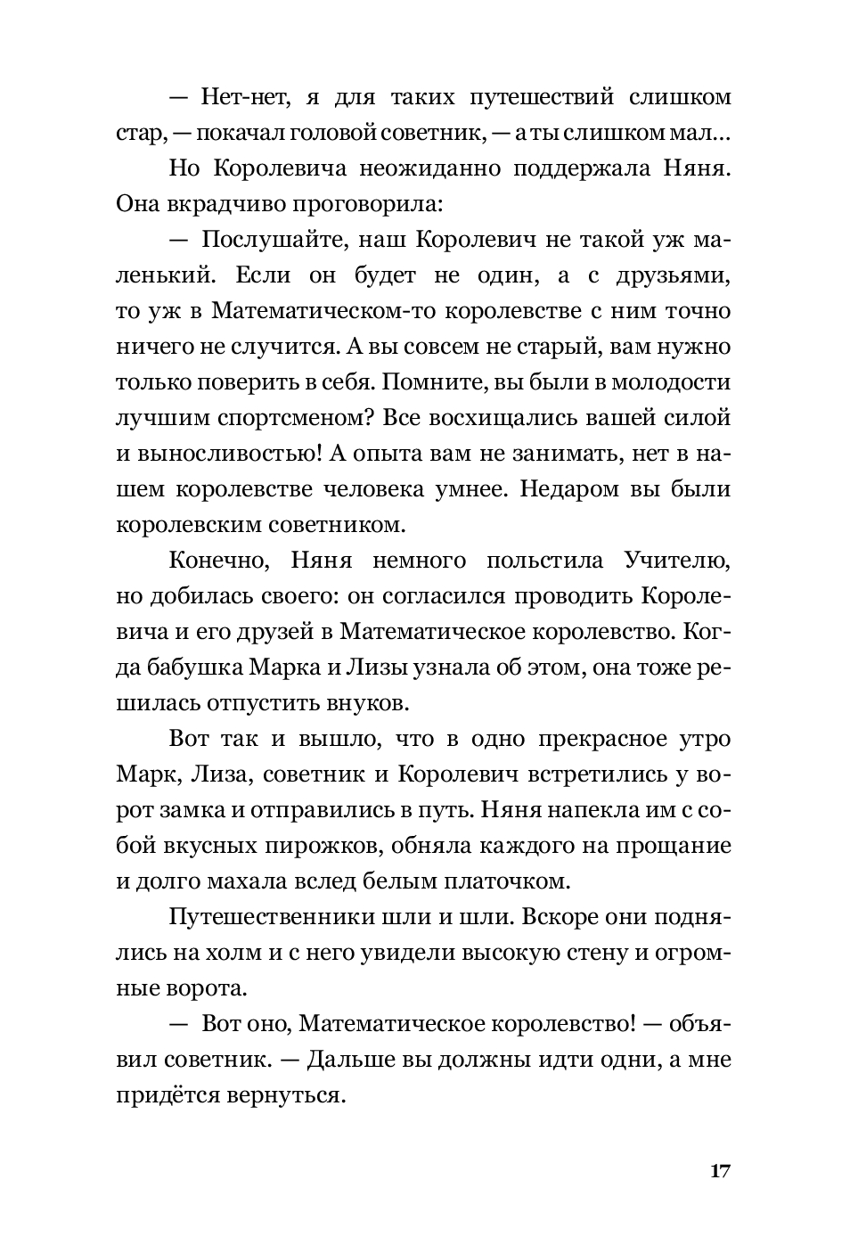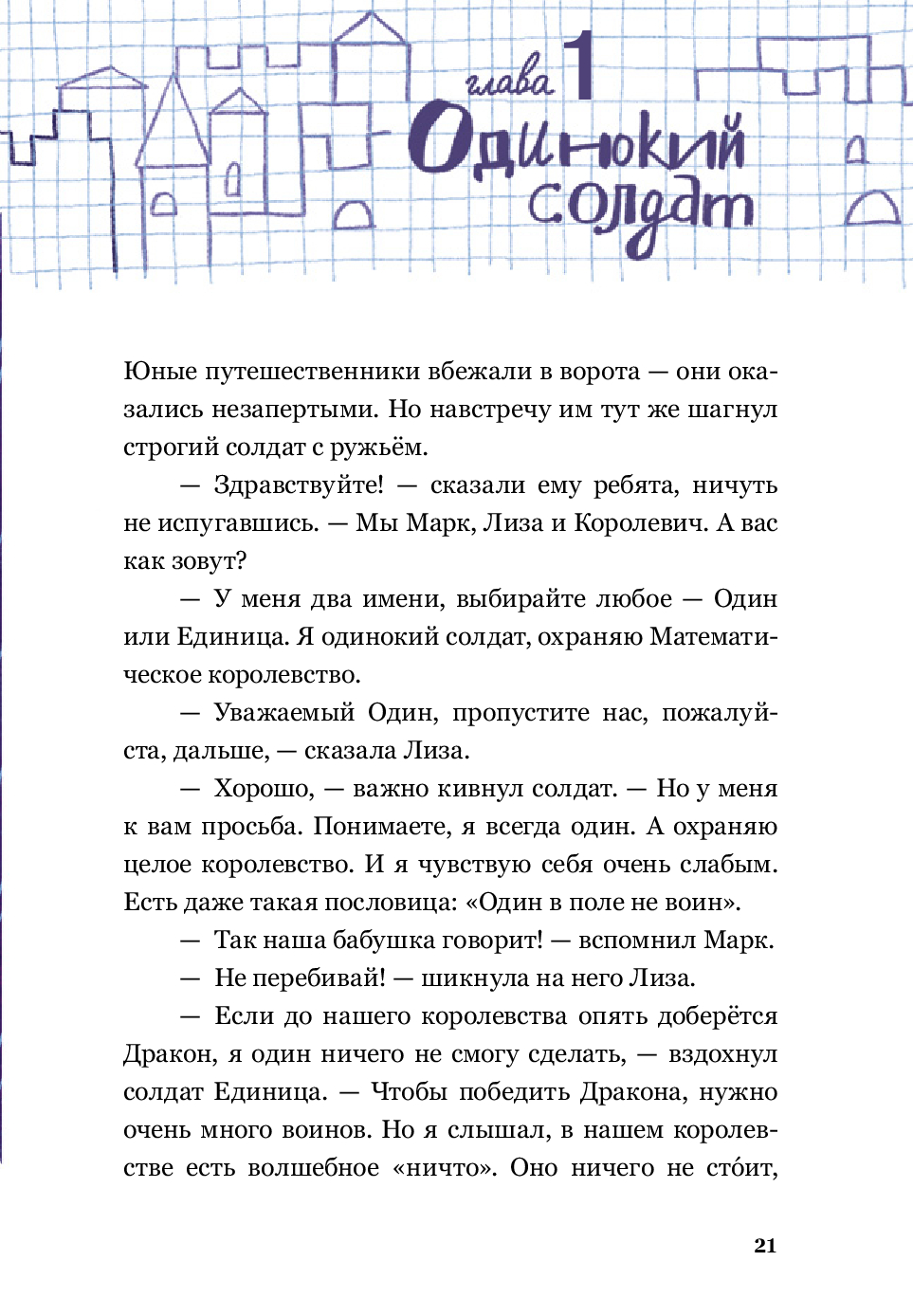 Страшный ураган унёс в Драконовы владения всех, кто пришёл на праздник по случаю рождения Королевича. Логово Дракона невидимо, и путь к нему лежит через Математическое королевство. Туда‑то и отправляются через шесть лет Королевич и его друзья Марк и Лиза, родителей которых тоже унёс ураган. Смогут ли ребята освободить пленников Дракона? Разгадают ли непростое заклинание, состоящее из цифр?