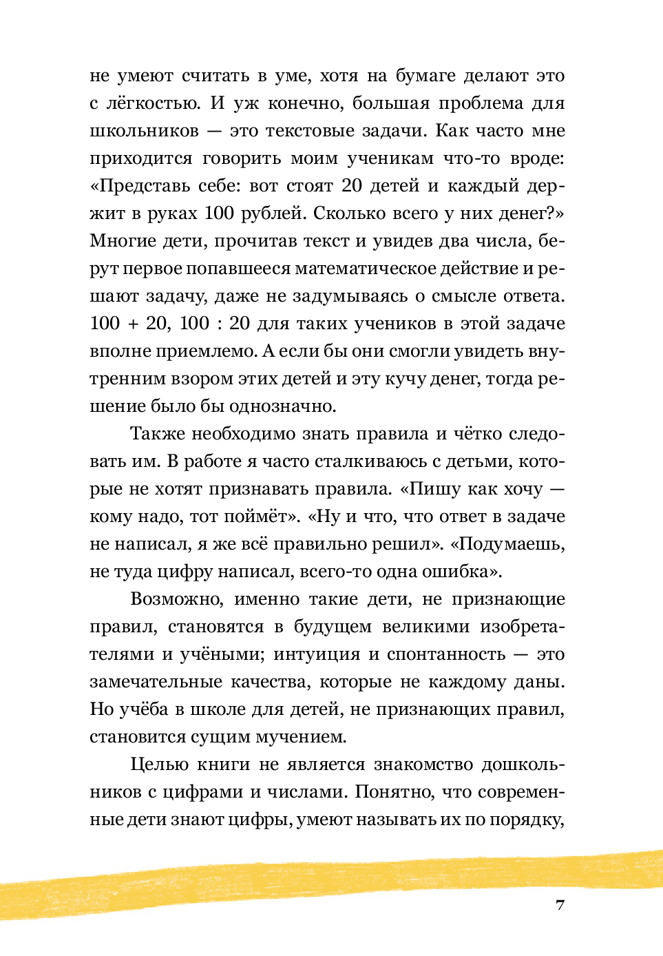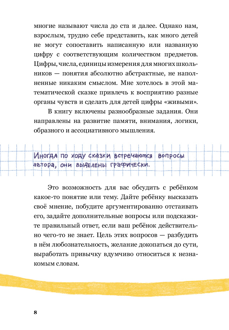 В этой книге увлекательная сказка тесно переплетена с развивающими заданиями и вопросами для обсуждения. Анна Видигер, преподаватель математики с двадцатилетним стажем, поможет дошкольникам подружиться с цифрами и числами. Читатели научатся видеть цифры внутренним зрением, легко запоминать и мыслить образно. А это – ключ к решению любой математической задачи!