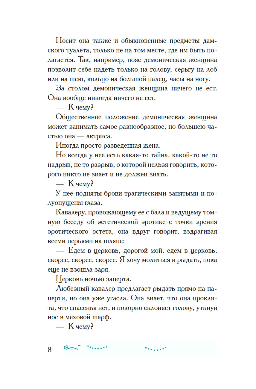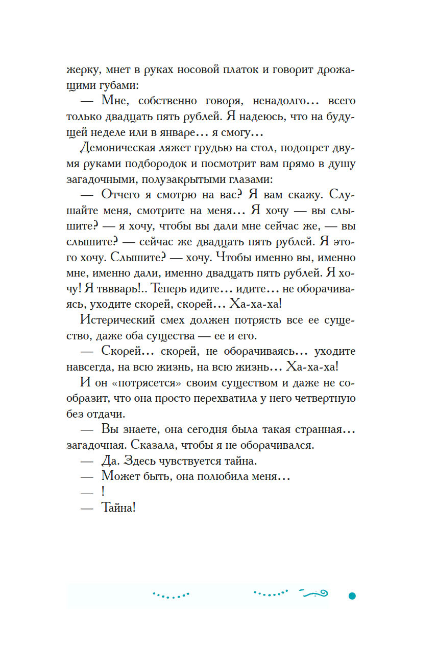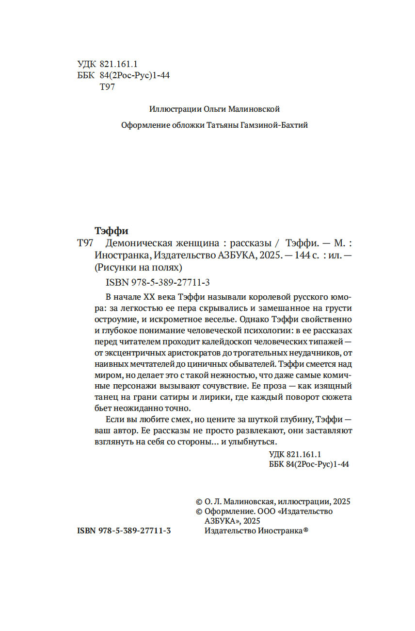 В начале XX века Тэффи называли королевой русского юмора: за легкостью ее пера скрывались и замешанное на грусти остроумие, и искрометное веселье. Однако Тэффи свойственно и глубокое понимание человеческой психологии: в ее рассказах перед читателем проходит калейдоскоп человеческих типажей – от эксцентричных аристократов до трогательных неудачников, от наивных мечтателей до циничных обывателей. Тэффи смеется над миром, но делает это с такой нежностью, что даже самые комичные персонажи вызывают сочувствие. Ее проза – как изящный танец на грани сатиры и лирики, где каждый поворот сюжета бьет неожиданно точно.