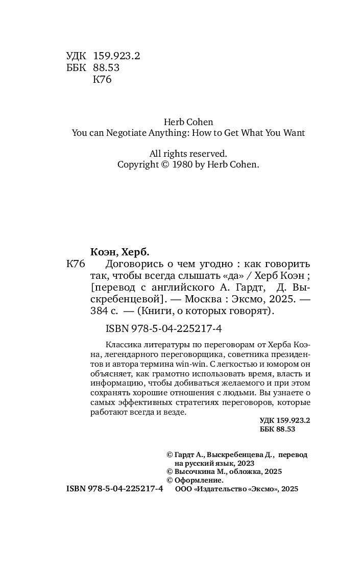 Классика литературы по переговорам от Херба Коэна, легендарного переговорщика, советника президентов и автора термина win-win. С легкостью и юмором он объясняет, как грамотно применять время, власть и информацию, чтобы добиваться желаемого и при этом сохранять хорошие отношения с людьми. Вы узнаете о самых эффективных стратегиях переговоров, которые работают всегда и везде.