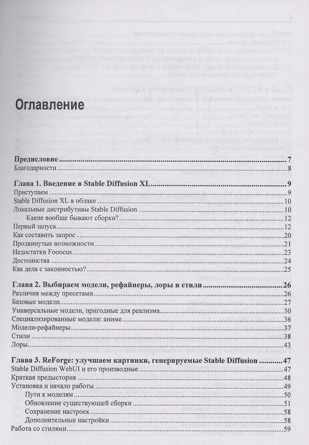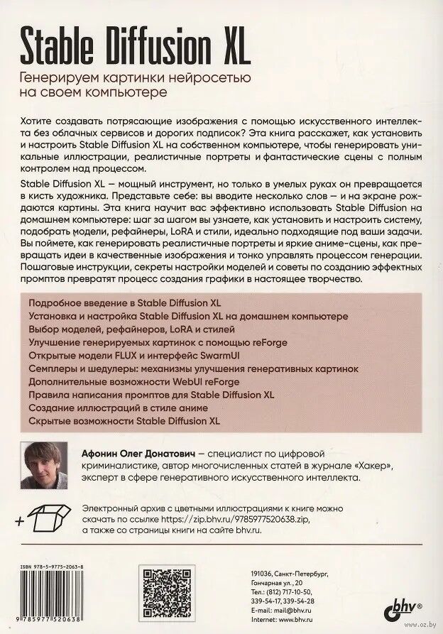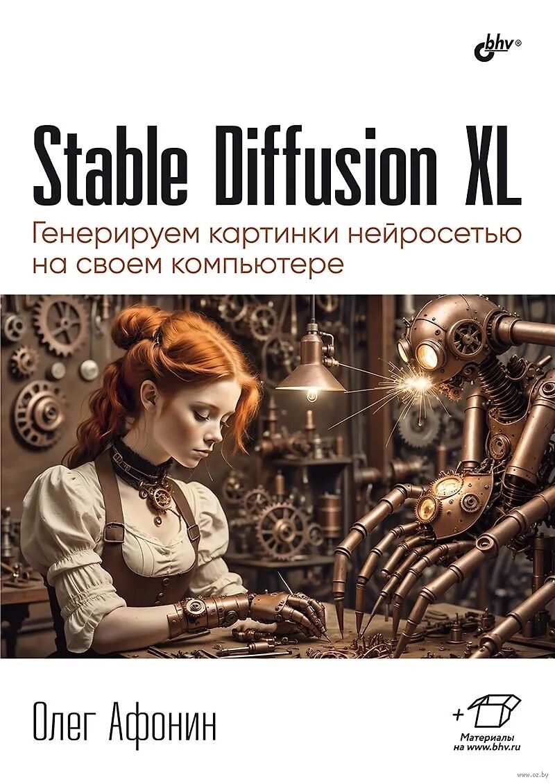Книга посвящена генерации изображений на домашнем компьютере с использованием нейросети Stable Diffusion XL. Подробно описана архитектура Stable Diffusion XL, шаг за шагом показан процесс установки и настройки программного обеспечения нейросети на домашнем компьютере, даны инструкции по выбору подходящих для задач пользователя моделей, рефайнеров, LoRA и стилей.