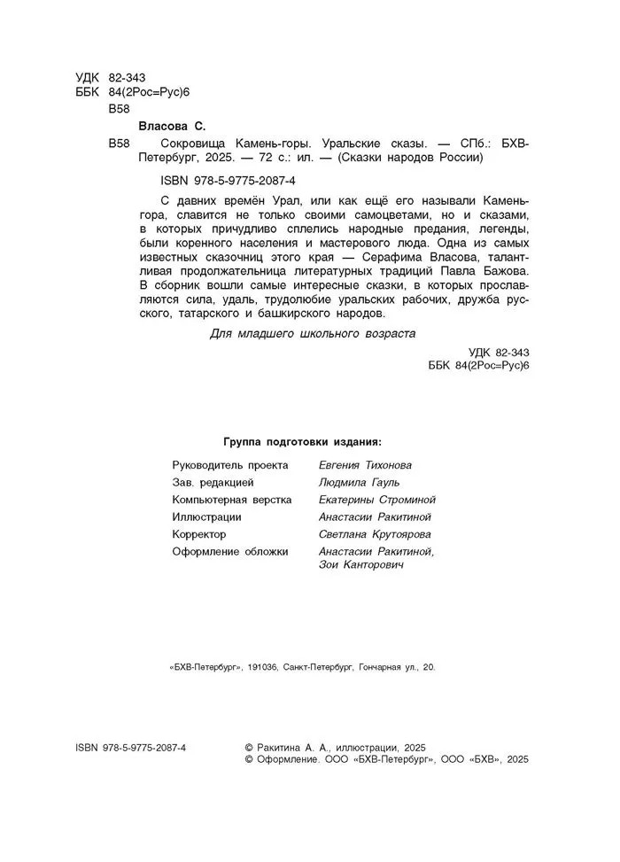Одна из самых известных сказочниц этого края – Серафима Власова, талантливая продолжательница литературных традиций Павла Бажова. В сборник вошли самые интересные сказки, в которых прославляются сила, удаль, трудолюбие уральских рабочих, дружба русского, татарского и башкирского народов.