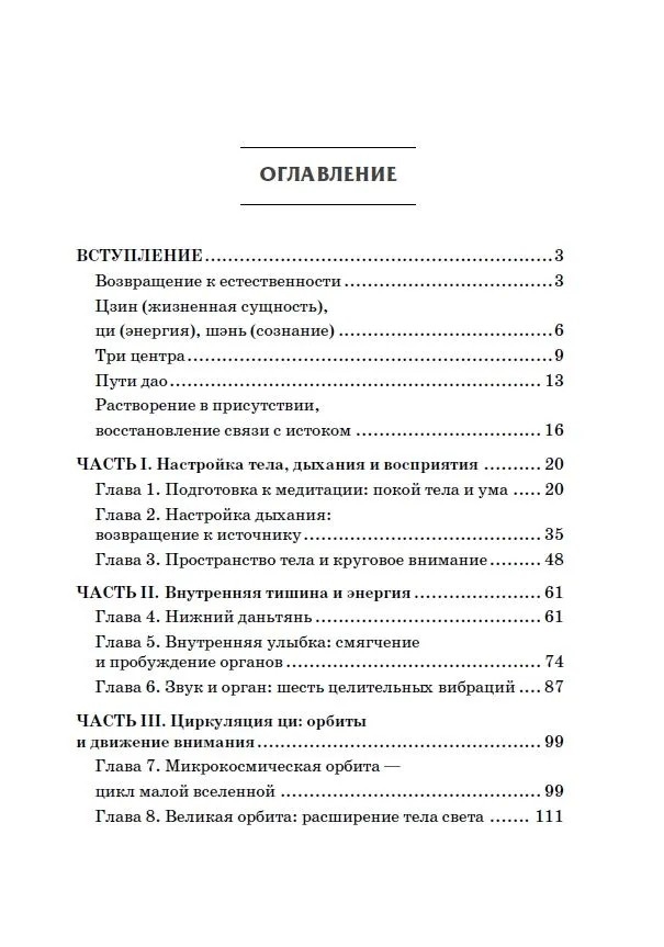 Пособие последовательно ведёт читателя от простых телесных настроек и дыхательных практик к более глубоким формам медитации: внутренней улыбке, циркуляции энергии в микрокосмической орбите, очищению органов звуком, наблюдению за пустотой ума и алхимии трёх сокровищ – цзин, ци и шэнь. Особое внимание уделено тому, как перенести медитативное состояние в повседневную активность, оставаясь в присутствии не только в тишине, но и в движении, словах и делах.