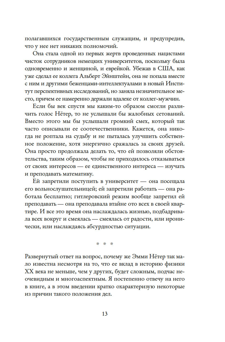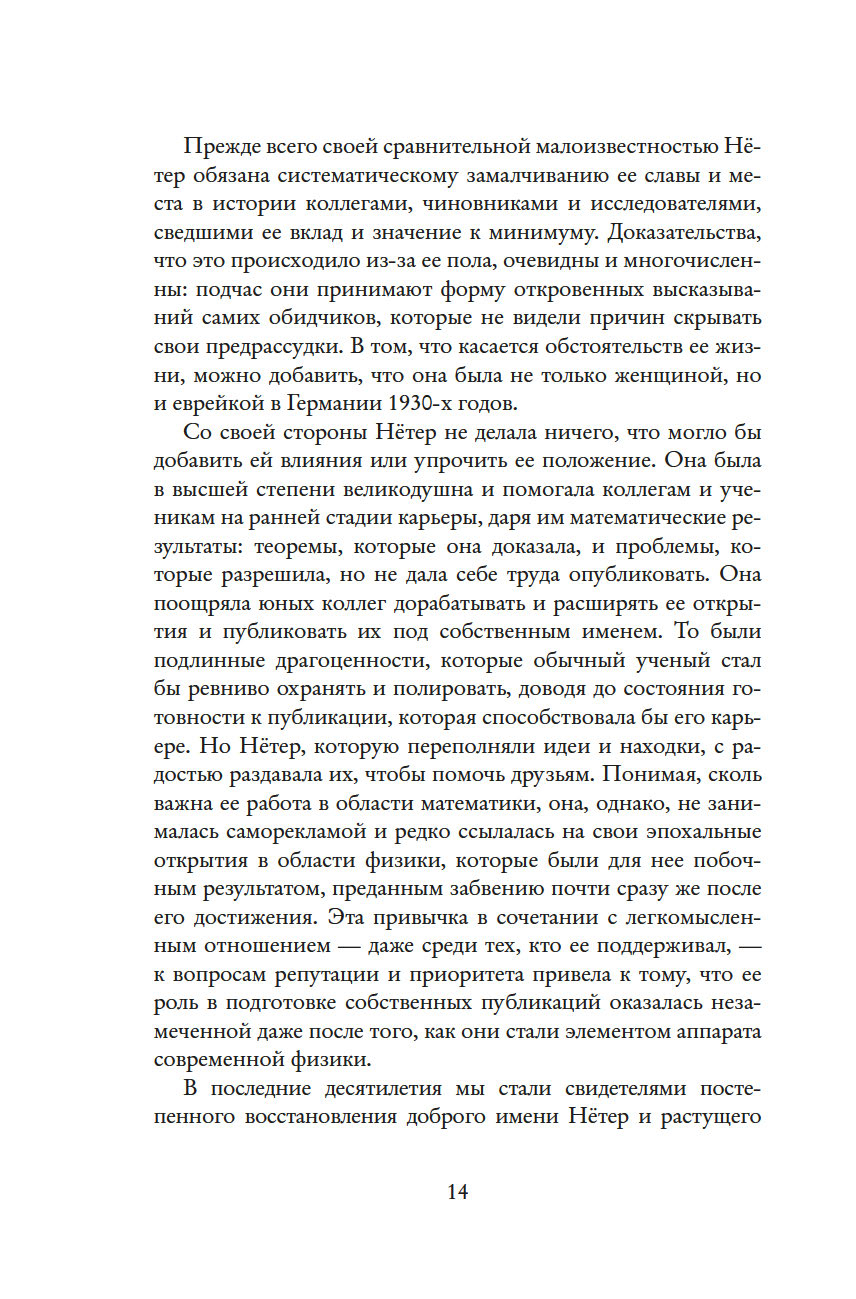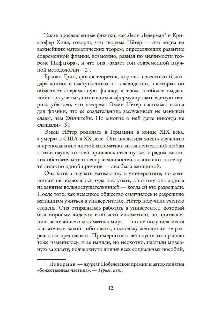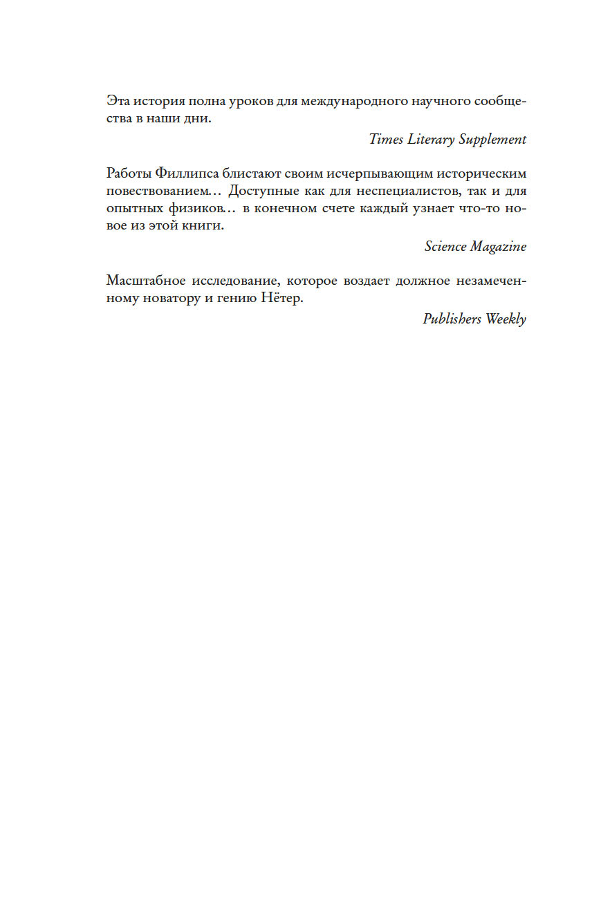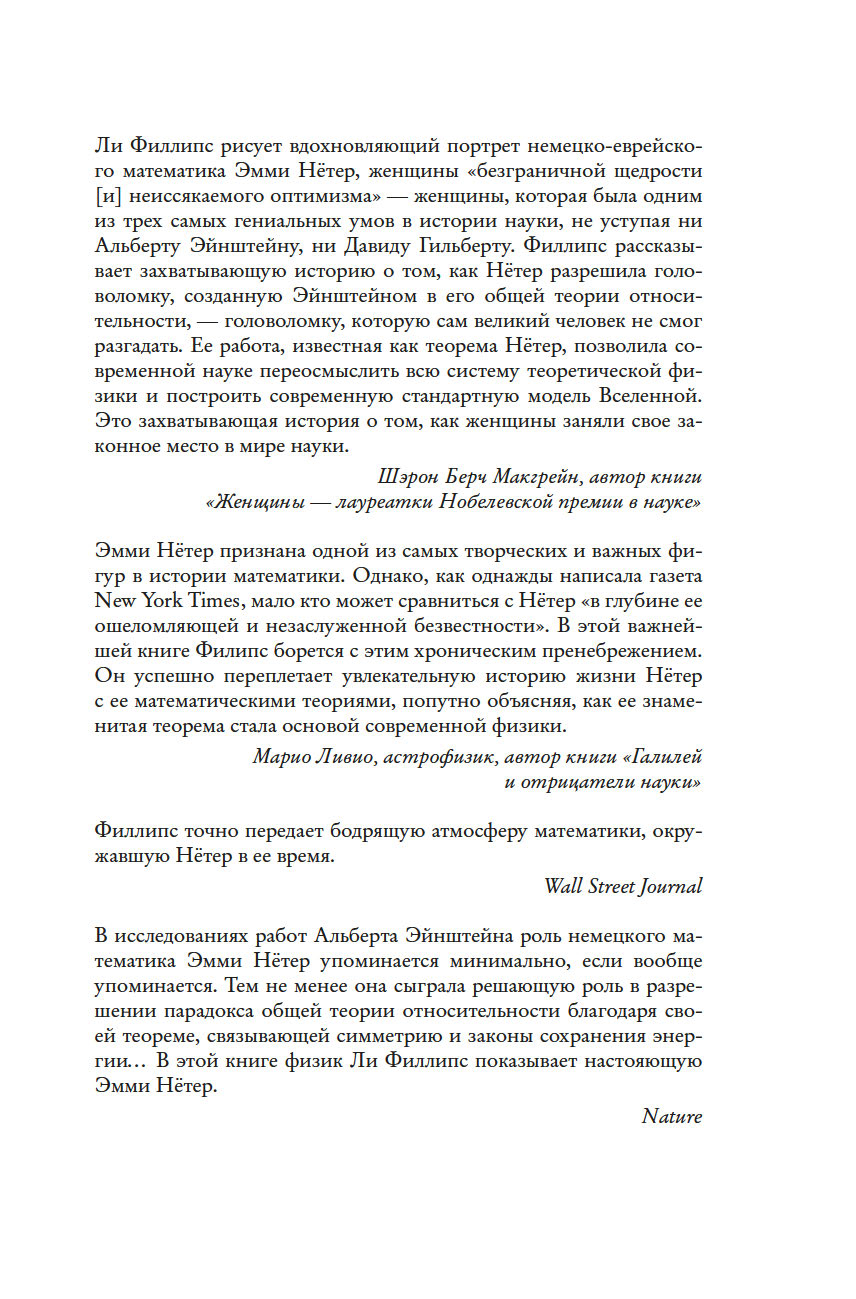 "Эмми Нётер посвятила жизнь изучению чистой математики, хотя ей пришлось столкнуться с рядом жестоких несправедливостей, возникших лишь по одной причине – она была женщиной. Она хотела изучать математику в университете, но женщинам не позволялось туда поступать. Она отправилась работать в университет по приглашению величайшего математика мира – но не получила места в штате или какой-либо платы. Она стала одной из первых жертв нацистских чисток сотрудников университетов, поскольку была одновременно и женщиной, и еврейкой. Если бы век спустя мы каким-то образом смогли различить голос Нётер, то не услышали бы жалобных сетований. Вместо этого мы бы услышали громкий смех, который так часто описывали ее соотечественники" (Ли Филлипс).