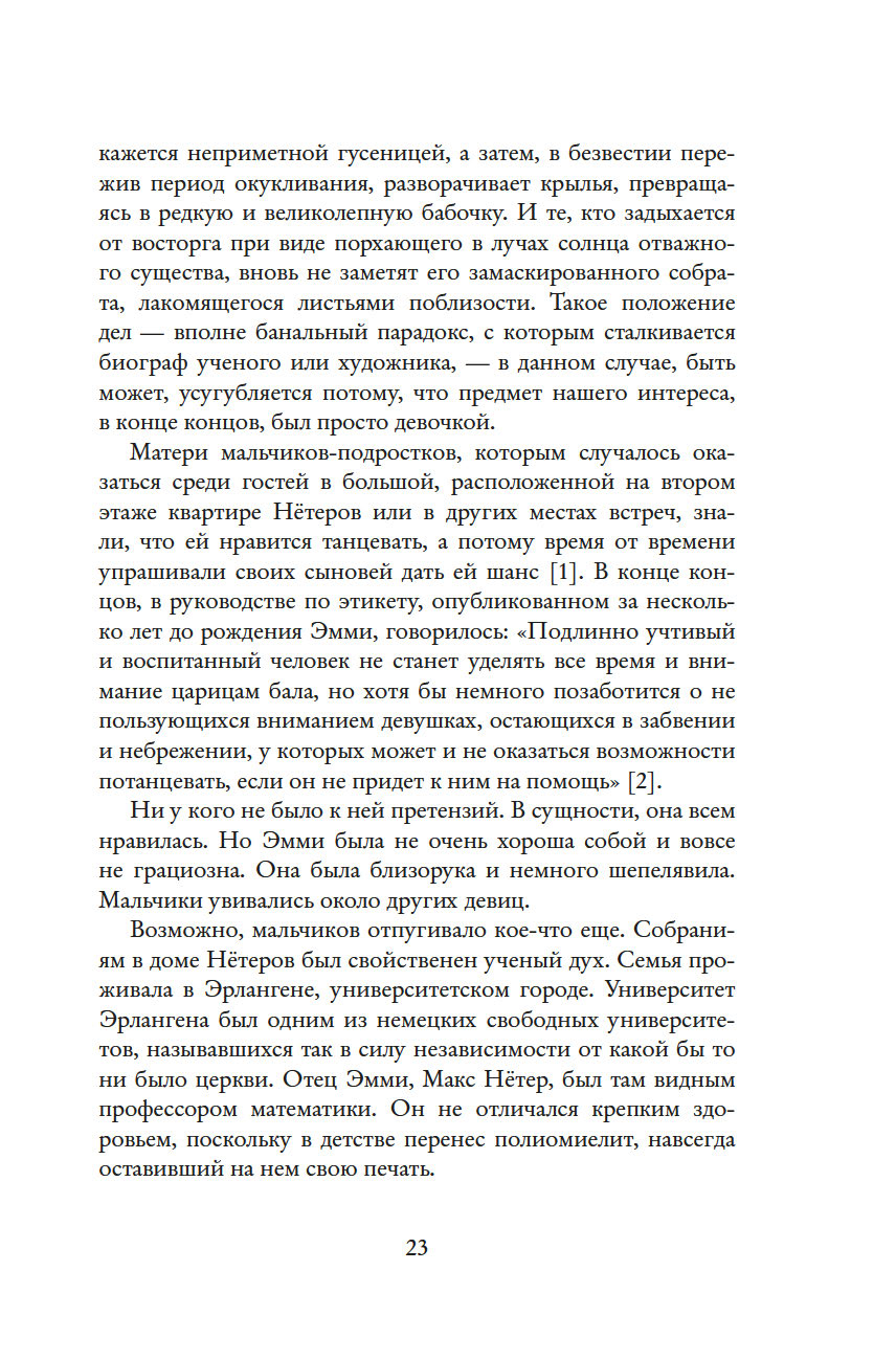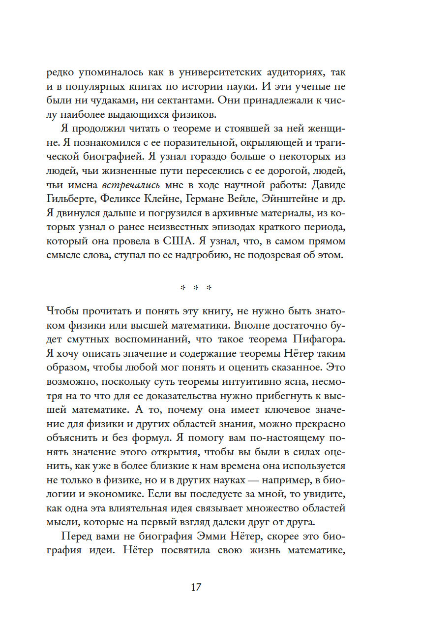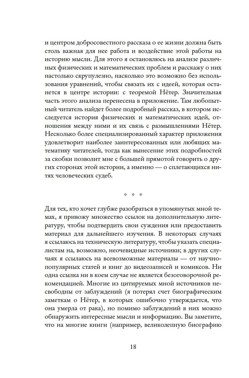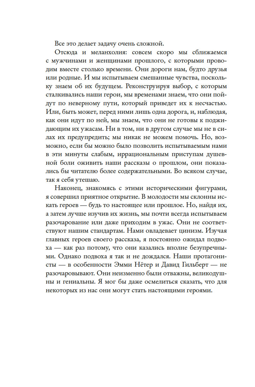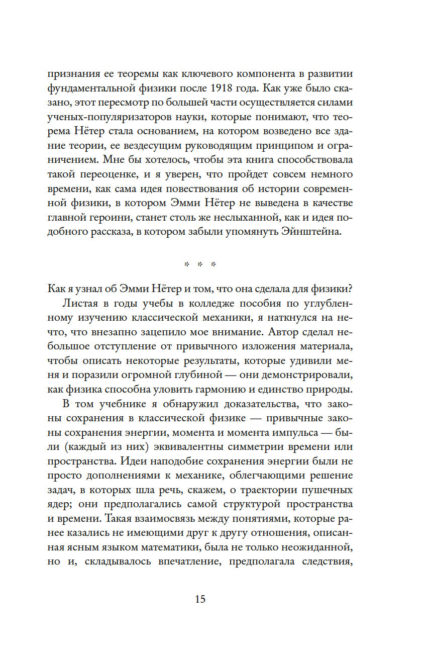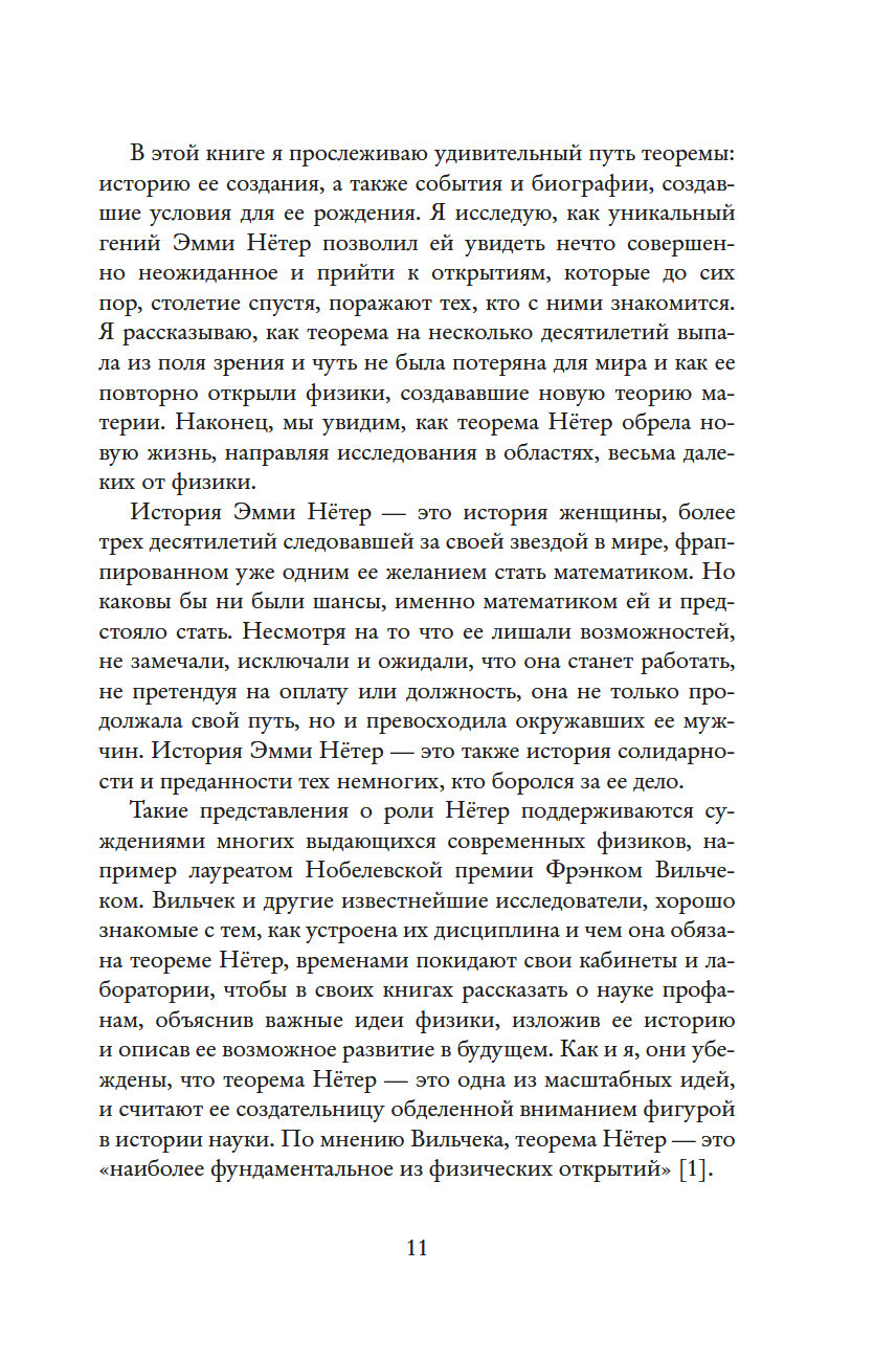 "Эмми Нётер посвятила жизнь изучению чистой математики, хотя ей пришлось столкнуться с рядом жестоких несправедливостей, возникших лишь по одной причине – она была женщиной. Она хотела изучать математику в университете, но женщинам не позволялось туда поступать. Она отправилась работать в университет по приглашению величайшего математика мира – но не получила места в штате или какой-либо платы. Она стала одной из первых жертв нацистских чисток сотрудников университетов, поскольку была одновременно и женщиной, и еврейкой. Если бы век спустя мы каким-то образом смогли различить голос Нётер, то не услышали бы жалобных сетований. Вместо этого мы бы услышали громкий смех, который так часто описывали ее соотечественники" (Ли Филлипс).