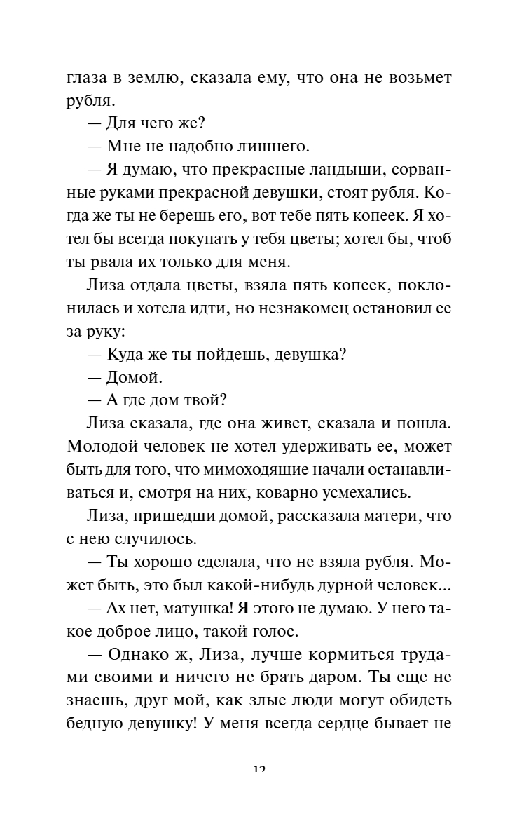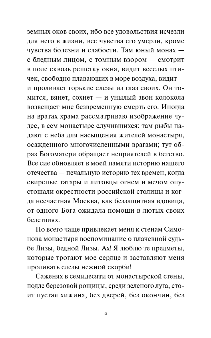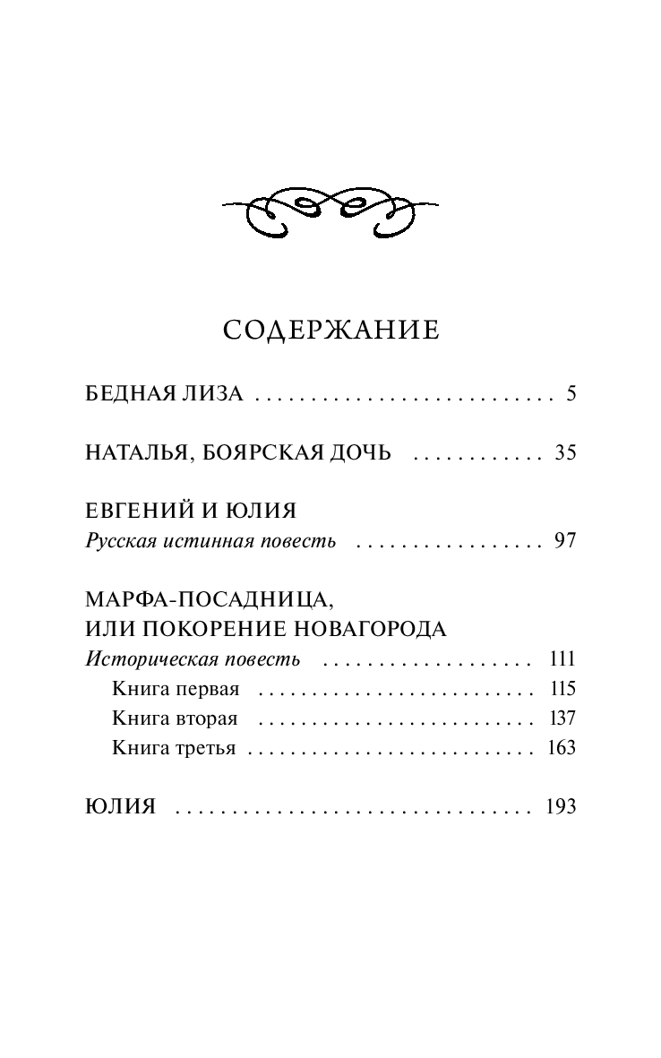Героини повестей, собранных в этом издании, принадлежат к разным сословиям и даже эпохам, их судьбы совсем не похожи. Но кое-что их объединяет: способность к сопереживанию, открытость миру, вера в любовь. Создав образы Лизы, Марфы, Натальи, Н. М. Карамзин изменил курс русской литературы и показал читателям удивительный и сложный мир чувств, в котором нет места простым решениям.