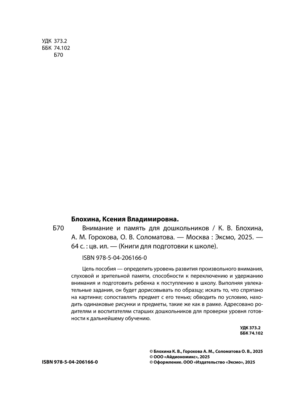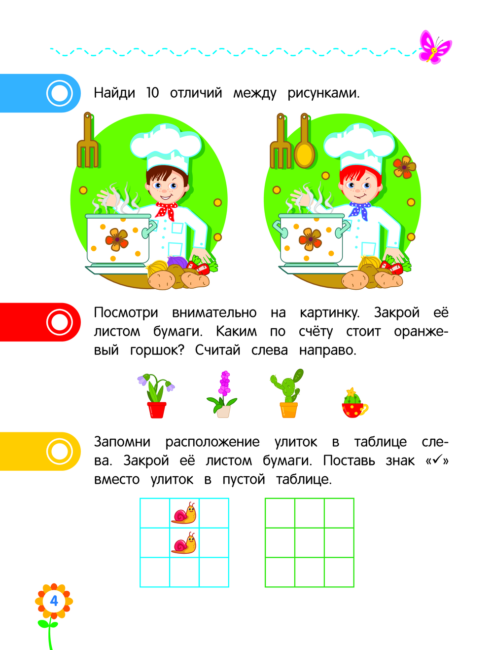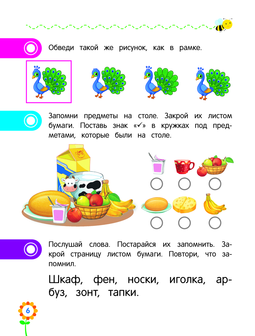 Цель пособия – определить уровень развития произвольного внимания, слуховой и зрительной памяти, способности к переключению и удержанию внимания и подготовить его к поступлению в школу. Выполняя увлекательные задания, ребенок будут дорисовывать по образцу; искать то, что спрятано на картинке; сопоставлять предмет с его тенью; обводить по условию, находить одинаковые рисунки и предметы такие же как в рамке. Адресовано родителям и воспитателям старших дошкольников для проверки уровня готовности к дальнейшему обучению.