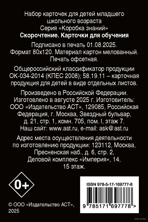 | Изготовитель | Творческое кооперативное объединение «АСТ». 129085, РФ, г. Москва, б-р Звездный, 21, стр. 1 |