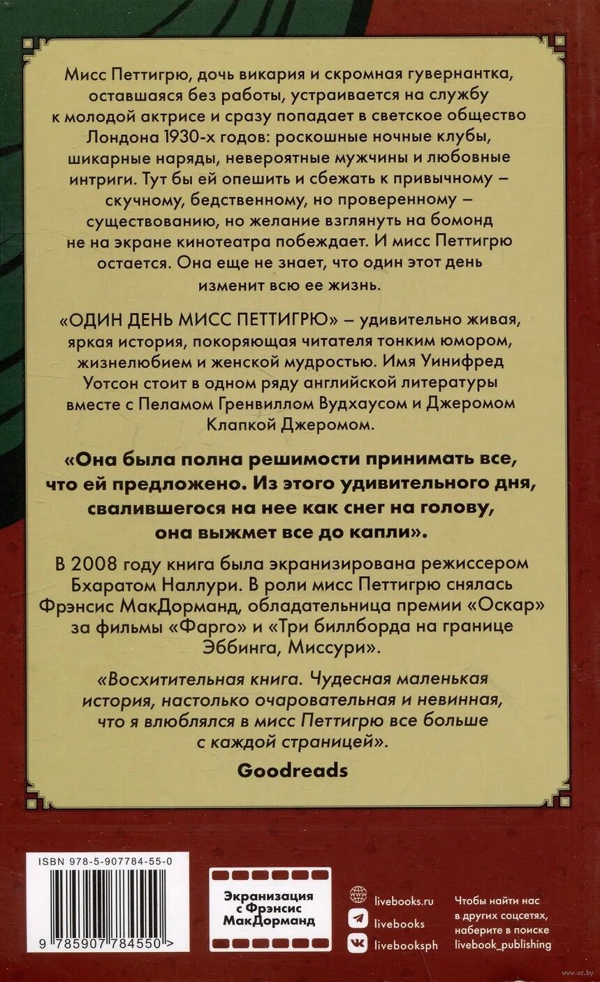 Мисс Петтигрю, дочь викария и скромная гувернантка, оставшаяся без работы, устраивается на службу к молодой актрисе и сразу попадает в светское общество Лондона 1930-х годов: роскошные ночные клубы, шикарные наряды, невероятные мужчины и любовные интриги. Тут бы ей опешить и сбежать к привычному – скучному, бедственному, но проверенному – существованию, но желание взглянуть на бомонд не на экране кинотеатра побеждает. И мисс Петтигрю остается. Она еще не знает, что один этот день изменит всю ее жизнь.