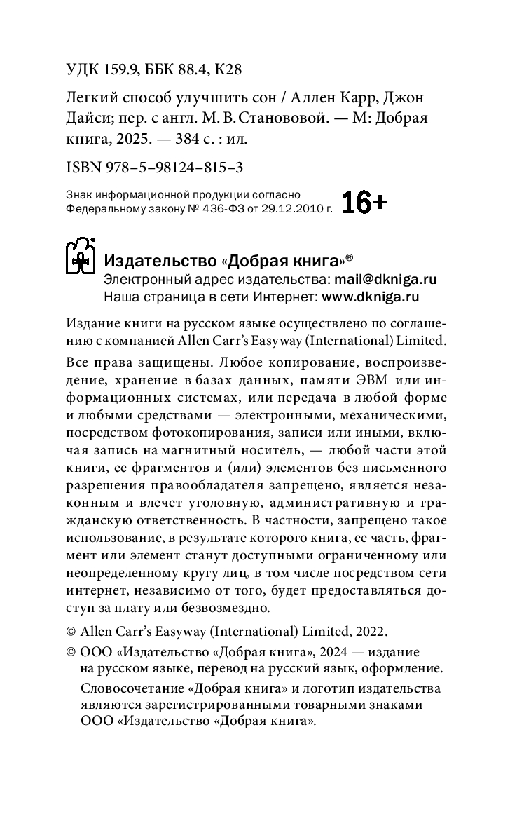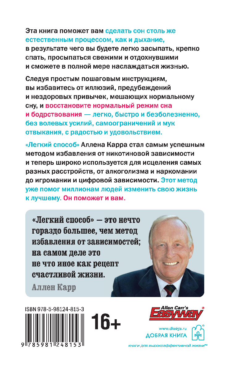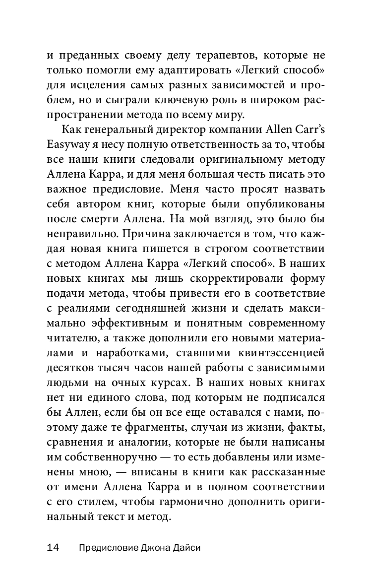 "Легкий способ" Аллена Карра стал самым успешным методом избавления от никотиновой зависимости и теперь широко используется для исцеления самых разных расстройств, от алкоголизма и наркомании до игромании и цифровой зависимости. Этот метод уже помог миллионам людей изменить свою жизнь к лучшему. Он поможет и вам.