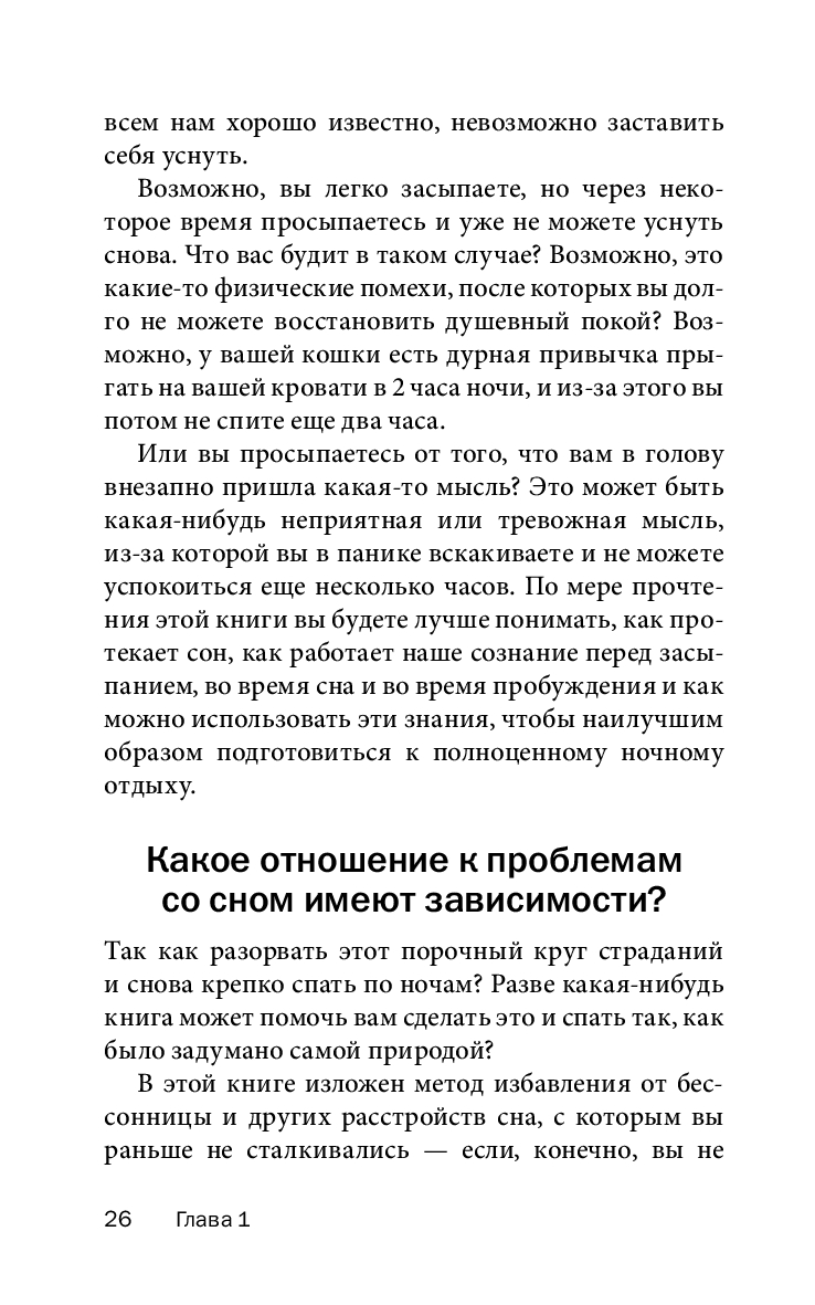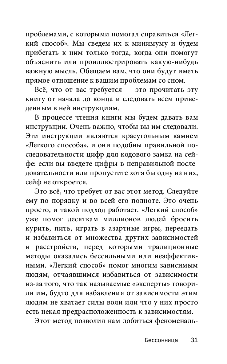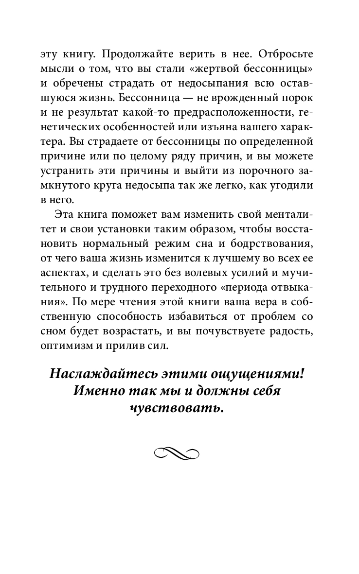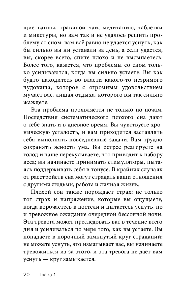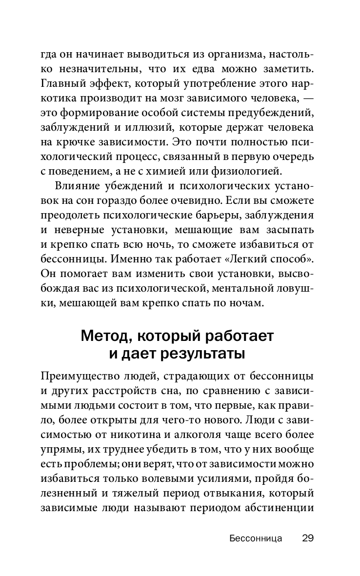 Следуя простым пошаговым инструкциям, вы избавитесь от иллюзий, предубеждений и нездоровых привычек, мешающих нормальному сну, и восстановите нормальный режим сна и бодрствования, – легко, быстро и безболезненно, без волевых усилий, самоограничений и мук отвыкания, с радостью и удовольствием.