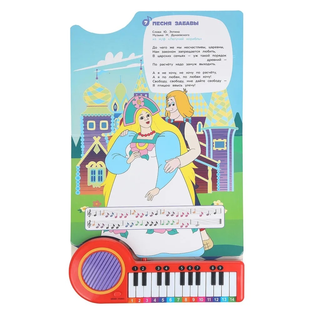 На каждой страничке это занимательной книги ребёнка ждут красивые иллюстрации, тексты песенок и ноты к ним. При нажатии на кнопку слева от клавиш происходит переключение на режим проигрывания песен, при втором нажатии – переключение на пианино. В режиме пианино маленький музыкант, нажимая на клавиши, сможет наиграть по нотам-подсказкам песенки из книги или придумать свои собственные мелодии. Книга сделана из плотного картона, поэтому мамы могут не опасаться, что ребёнок порвёт странички.