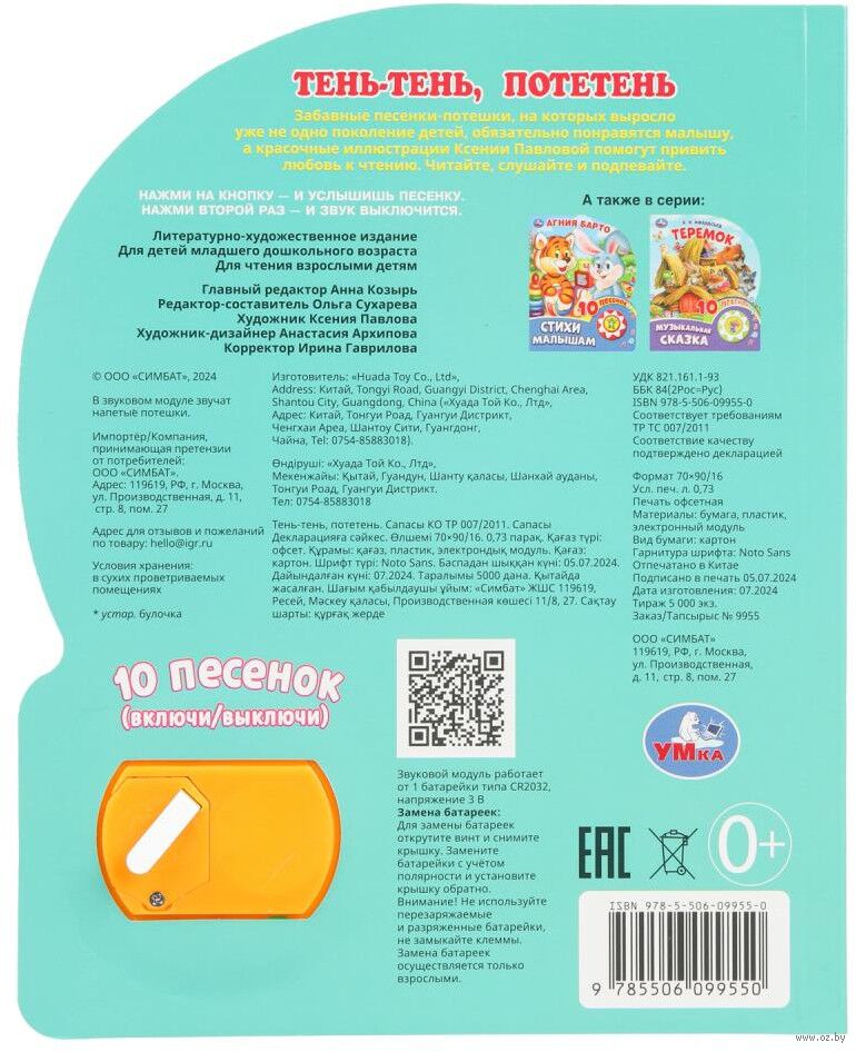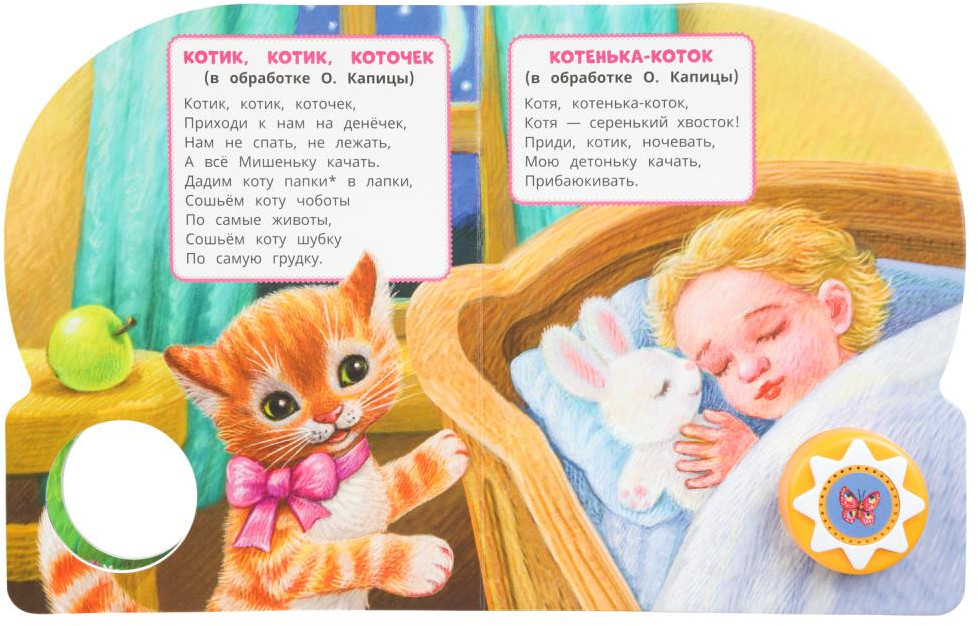 Ребёнок с удовольствием будет листать плотные картонные страницы, рассматривать красочные картинки, нажимать на кнопку и слушать задорные потешки. Малыш легко освоит включение звука: при нажатии на кнопку включится первая песенка, при втором нажатии выключится, в 3-ий раз – заиграет следующая и т.д. Благодаря компактному формату книгу удобно взять с собой в дорогу.
