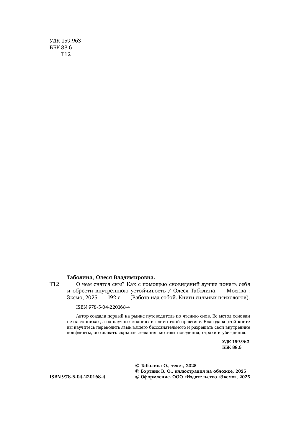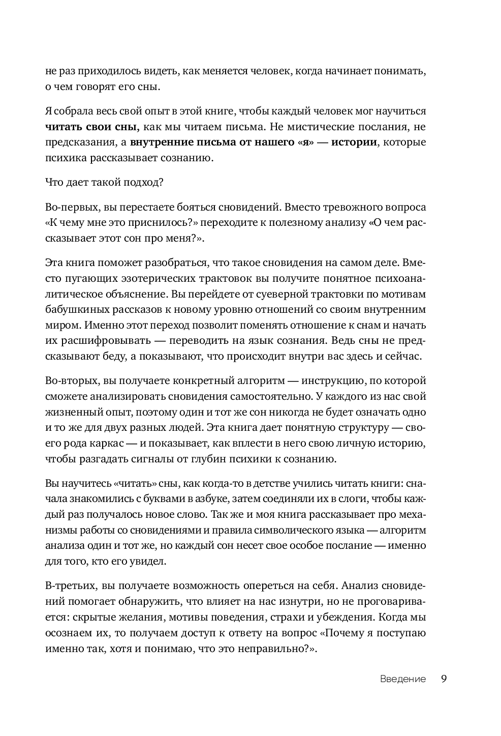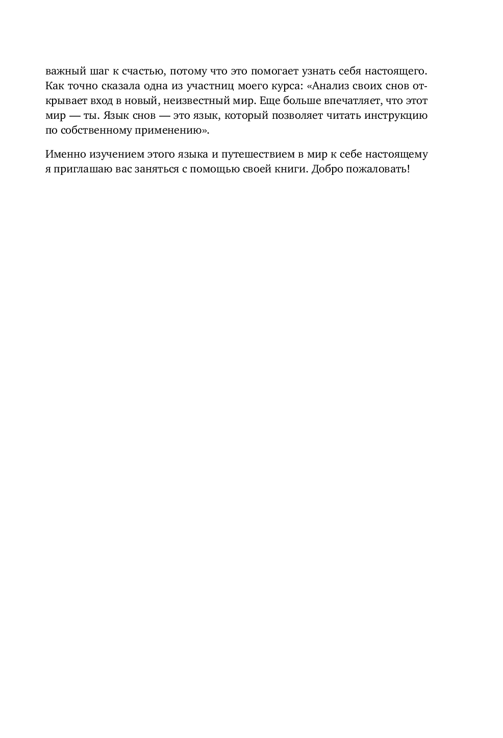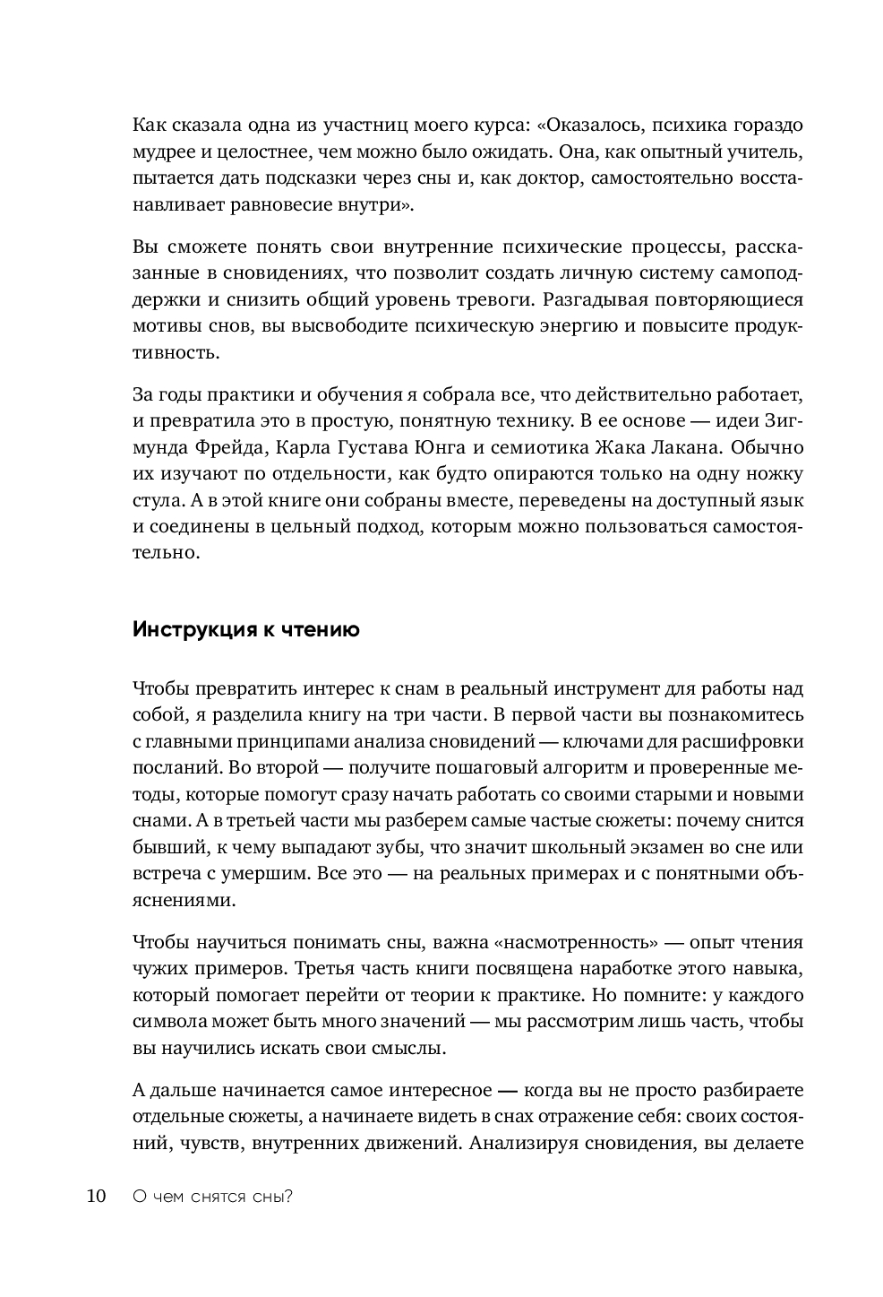 Автор создала первый на рынке ПУТЕВОДИТЕЛЬ ПО ЧТЕНИЮ СНОВ. Ее метод основан не на сонниках, а на научных знаниях и клиентской практике. Благодаря этой книге вы научитесь переводить язык вашего бессознательного и разрешать свои внутренние конфликты, осознавать скрытые желания, мотивы поведения, страхи и убеждения.