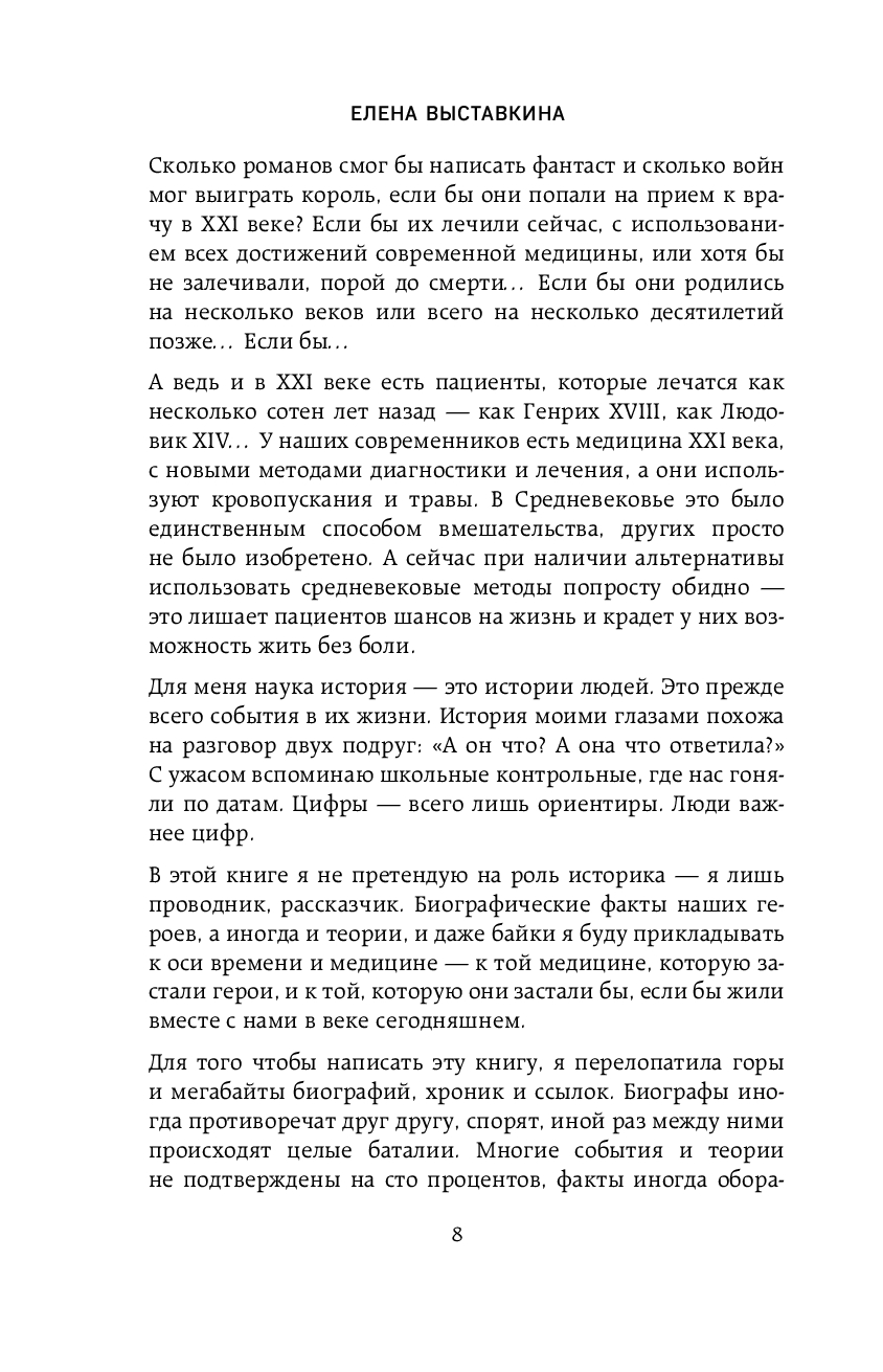 Автор книги – Елена Выставкина – врач с 19-летним опытом и блестящим слогом проанализировала историческую хронику и биографии известных людей, чтобы дать ответы на эти вопросы. Вы поймете, как развивалась медицина и где остаются ее пределы, как болезни формируют судьбы и почему забота о здоровье – это вклад в будущее.
