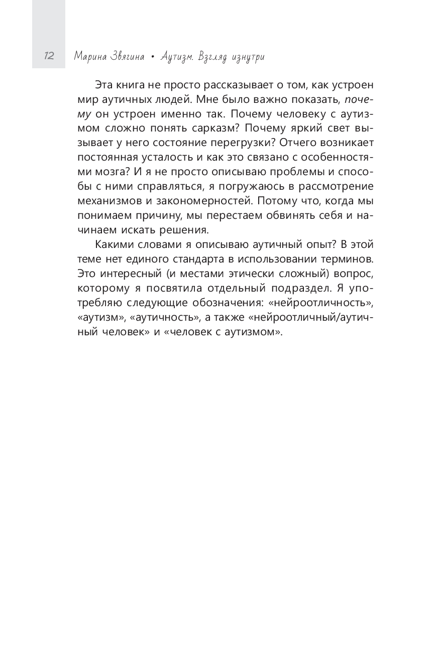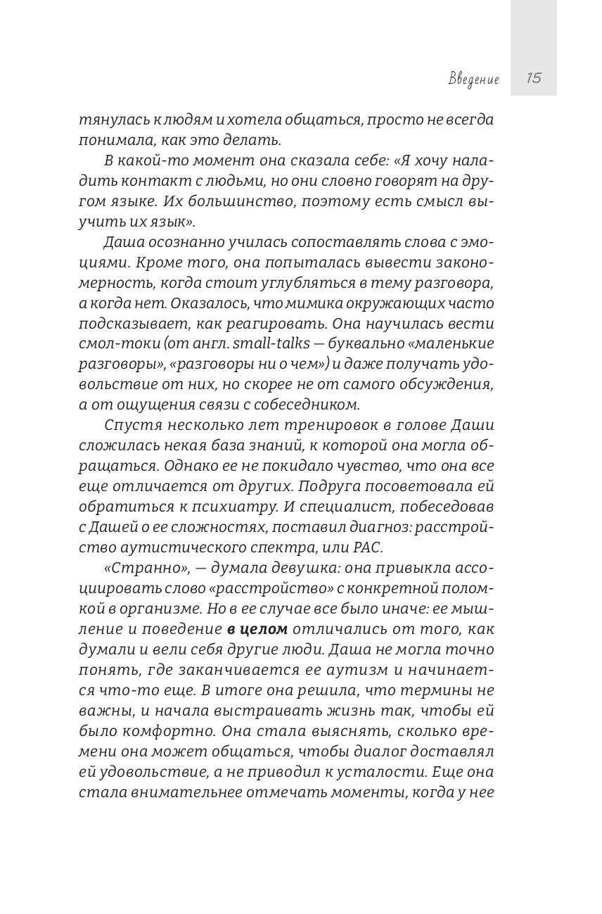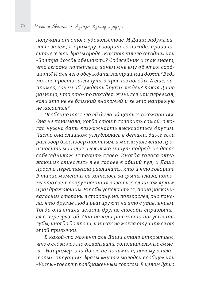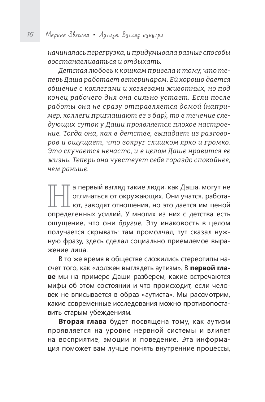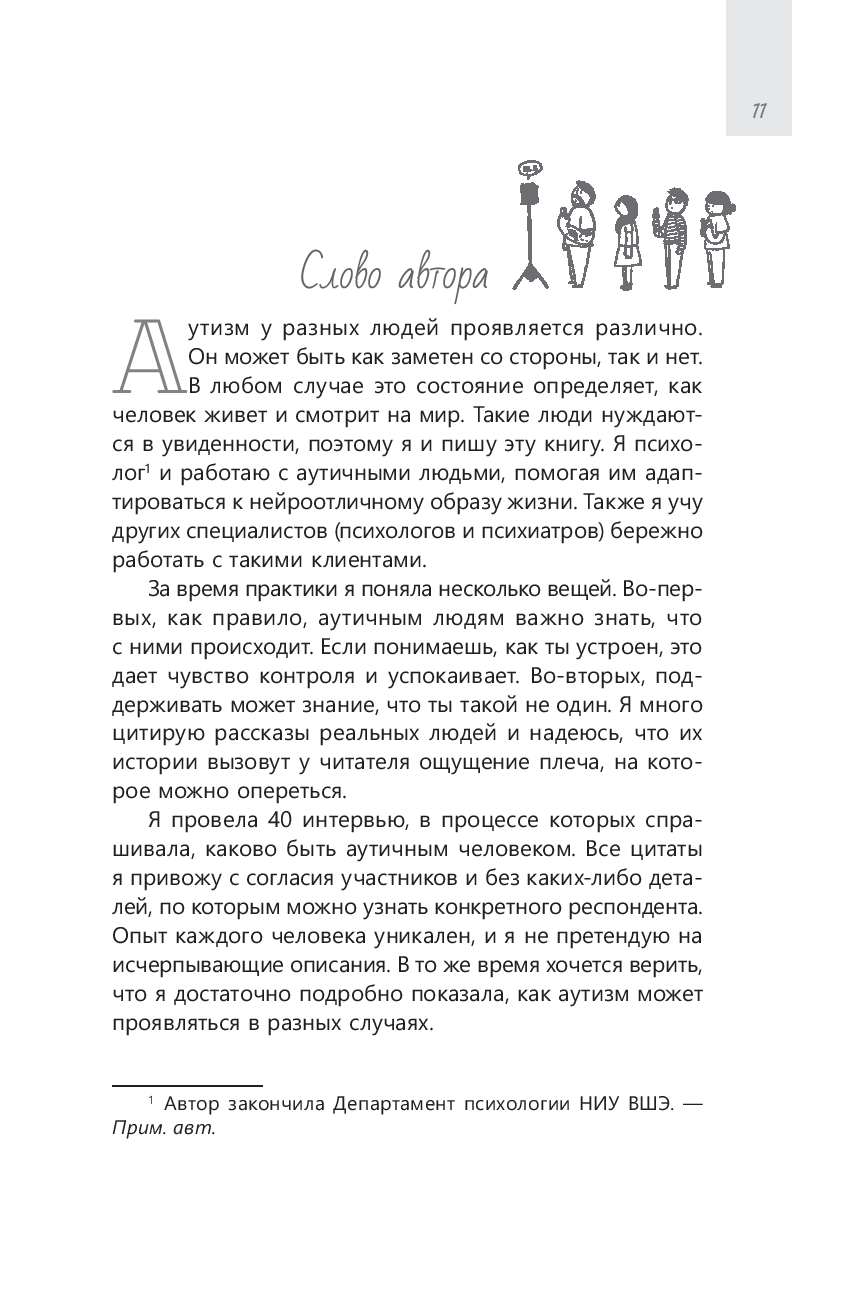 Аутизм у разных людей проявляется по-разному: у кого-то он заметен с детства, а кто-то годами живет, не зная, что причина постоянной усталости, сенсорной перегрузки и чувства непохожести на других – в особенностях его нервной системы. Эта книга написана для того, чтобы помочь таким людям увидеть и понять себя, назвать то, что раньше казалось необъяснимым, понять, что с этим делать и почувствовать, что они не одни.
