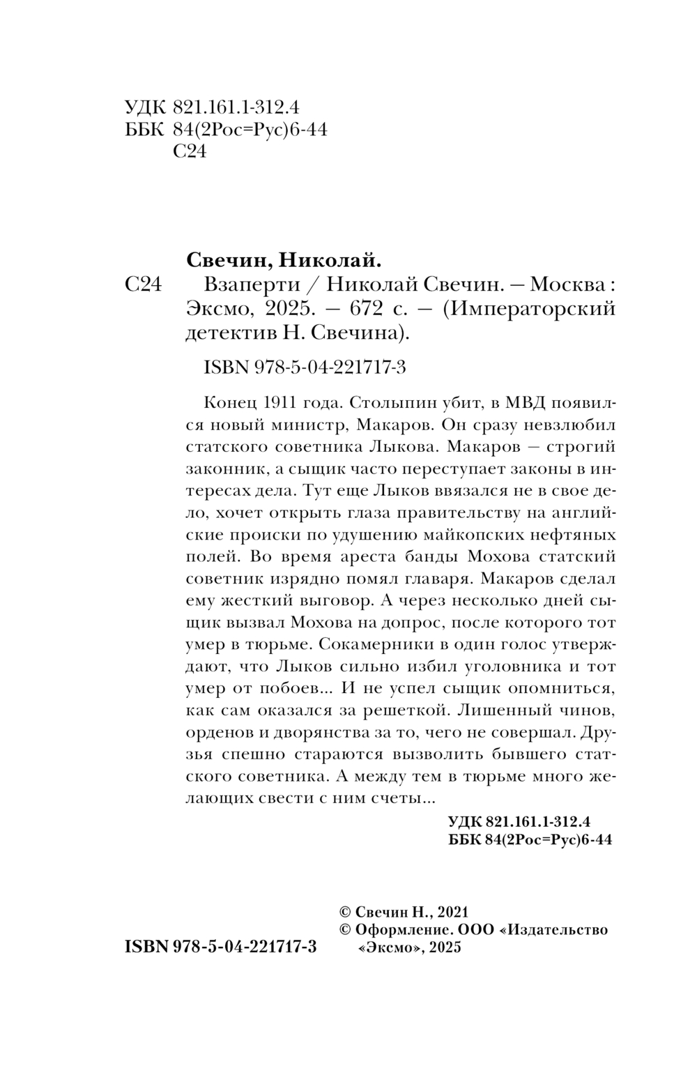 Конец 1911 года. Столыпин убит, в МВД появился новый министр Макаров. Он сразу невзлюбил статского советника Лыкова. Макаров – строгий законник, а сыщик часто переступает законы в интересах дела. Тут еще Лыков ввязался не в свое дело, хочет открыть глаза правительству на английские происки по удушению майкопских нефтяных полей. Во время ареста банды Мохова статский советник изрядно помял главаря. Макаров сделал ему жесткий выговор. А через несколько дней сыщик вызвал Мохова на допрос, после которого тот умер в тюрьме. Сокамерники в один голос утверждают, что Лыков сильно избил уголовного, и тот умер от побоев… И не успел сыщик опомниться, как сам оказался за решеткой. Лишенный чинов, орденов и дворянства за то, чего не совершал. Друзья спешно стараются вызволить бывшего статского советника. А между тем в тюрьме много желающих свести с ним счеты…