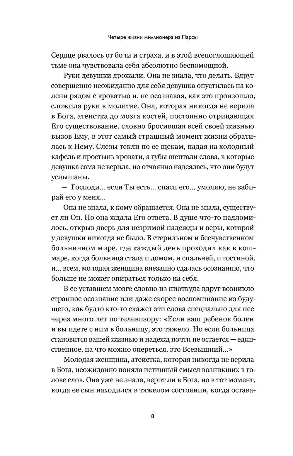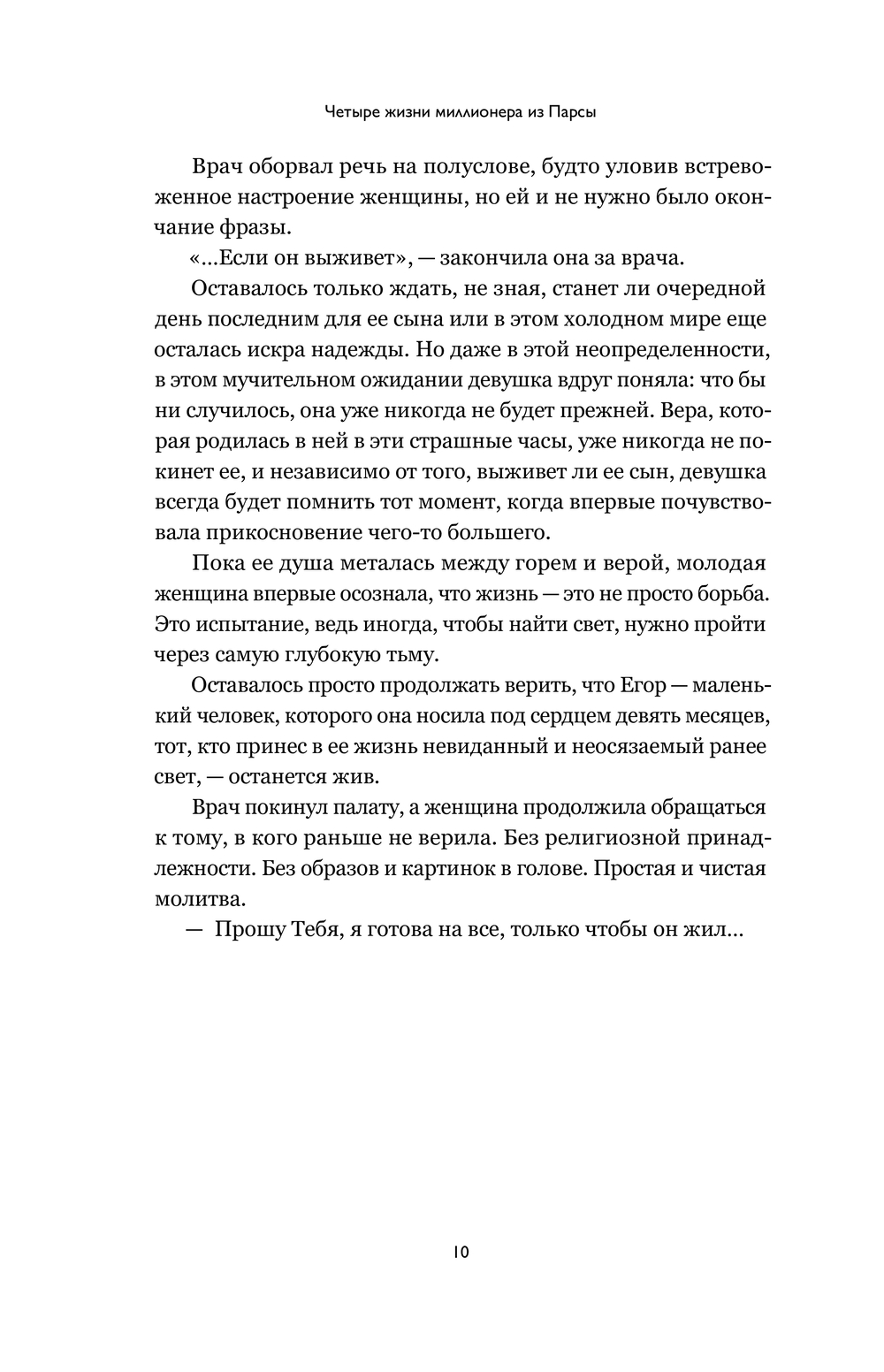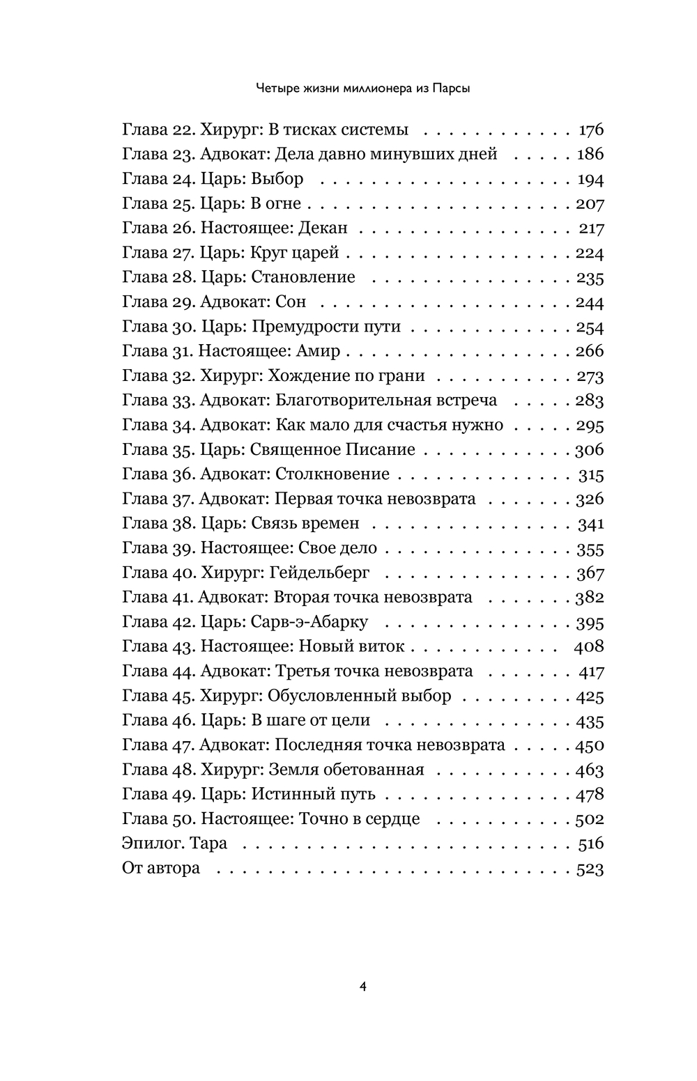 Роман "Четыре жизни миллионера из Парсы" раскроет историю самых разных персонажей: от непреклонного царя Персии до изворотливого адвоката, – показывая, как одно решение может изменить все. В одно мгновение победитель множества сражений совершает роковую ошибку и оказывается в плену, а карьерист оставляет идею "добиться цели любой ценой" и прислушивается к людям вокруг.