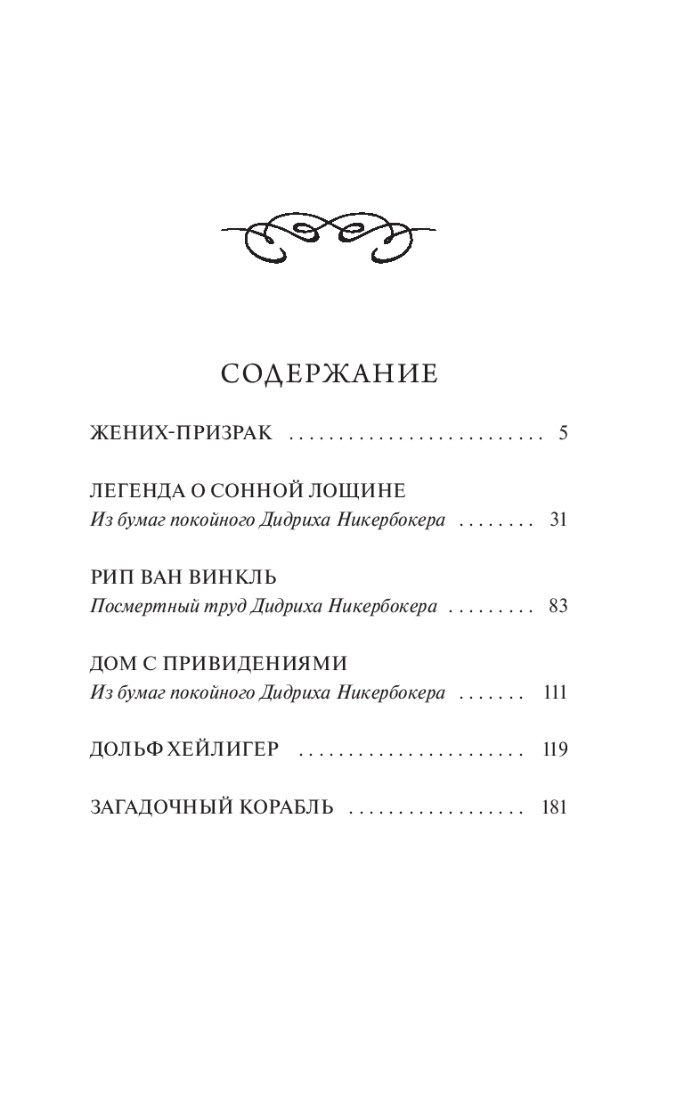 В книгу вошли и другие новеллы Ирвинга – "Жених-призрак", "Рип ван Винкль", "Дом с привидениями", "Дольф Хейлигер", "Загадочный корабль".