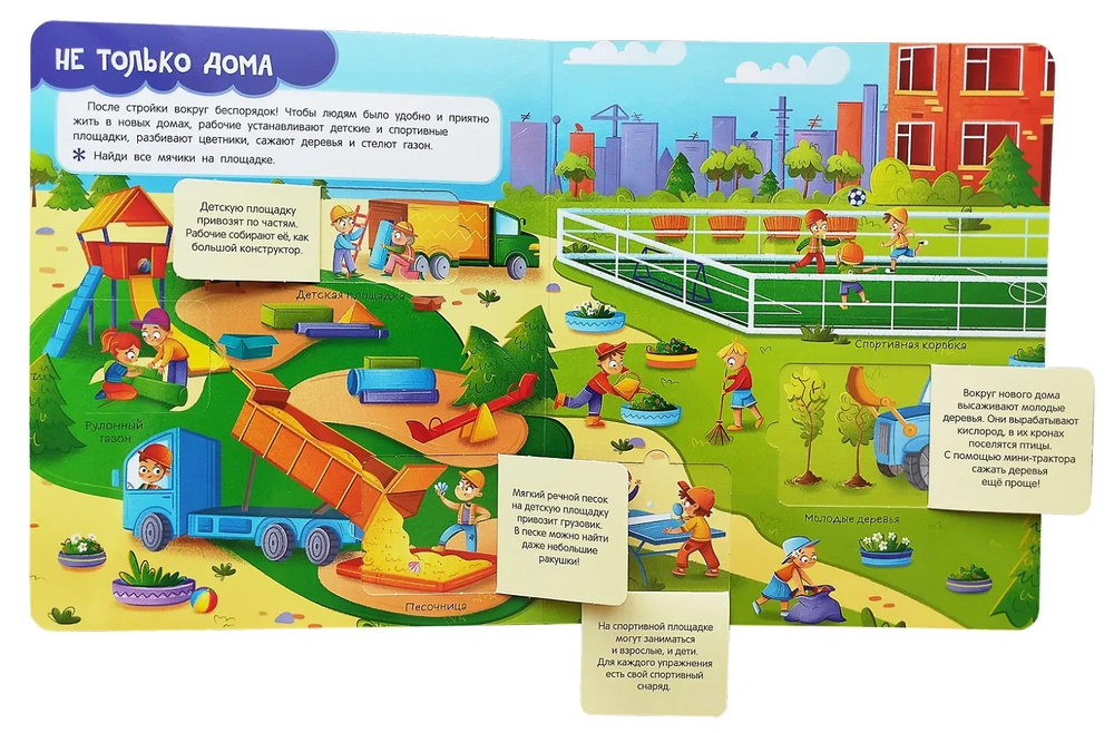 "Книги с окошками для малышей и малышек" серия полезных книг для детей. На каждом развороте яркие современные иллюстрации, и небольшое развивающее задание. Под множеством окошек-флепов скрываются яркие картинки и дополнительная информация. Дети узнают, как организована работа на стройке, встретятся с рабочими-строителями разных специальностей и познакомятся с умными машинами, строящими дома, дороги и мосты.