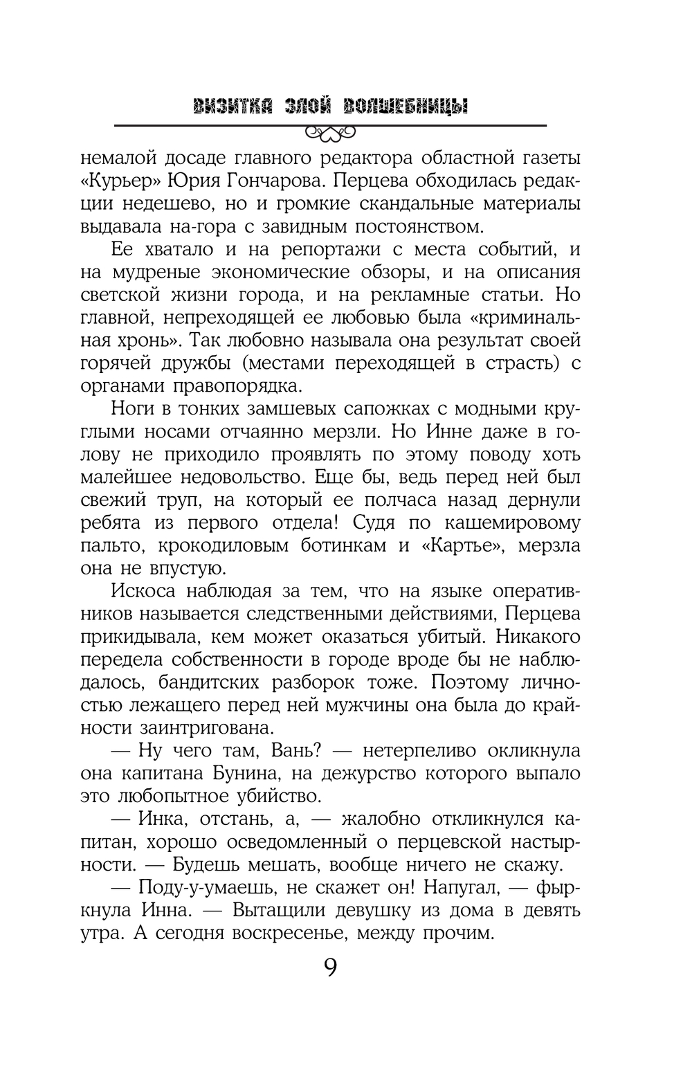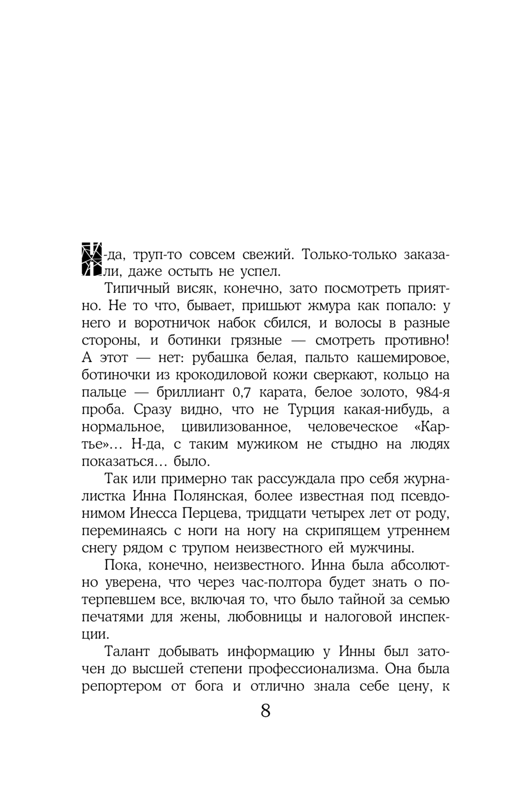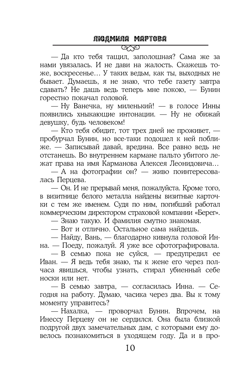Инна Полянская, более известная под псевдонимом Инесса Перцева, была репортером от бога! Перцева обходилась редакции недешево, но громкие скандальные материалы выдавала с завидным постоянством. Даже ее собственный брак не обошелся без интриги: Инна тогда уволилась из газеты и устроилась посудомойкой в кафе Ледового дворца, чтобы привлечь внимание понравившегося ей хоккеиста!.. Вот и сейчас она взялась за острую тему – убийство исполнительного директора процветающей страховой компании "Берег. Богатый бизнесмен, женатый на победительнице городского конкурса красоты, расстрелян его сыном Глебом от первого брака – это первая полоса, как пить дать! Но постепенно холодный профессиональный интерес сменился искренним сочувствием: оказалось, Инна знала Глеба с детства, и теперь его убитая горем мать попросила журналистку доказать его невиновность…