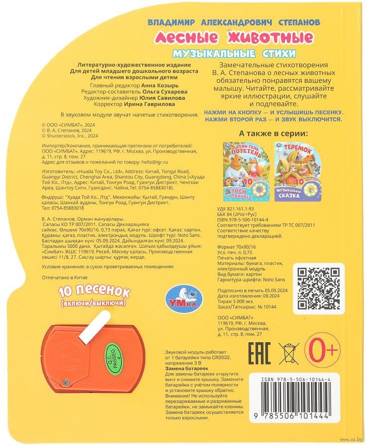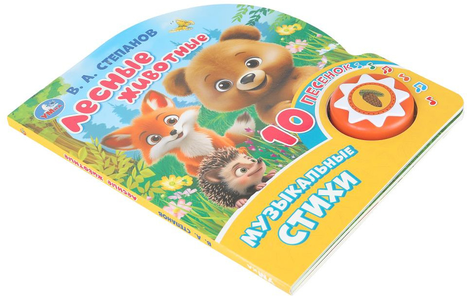 Музыкальная книга "В. Степанов. Лесные животные" станет прекрасным подарком для ребёнка. Малыш будет с удовольствием рассматривать яркие страницы с изображением животных, читать стихи и слушать песенки о них. Одно нажатие на кнопку – песенка включится, второе нажатие – выключится, при третьем нажатии заиграет следующая композиция. Книжка сделана из плотного картона, поэтому родители могут не опасаться, что ребёнок порвёт её. Благодаря компактному формату книгу удобно брать с собой.