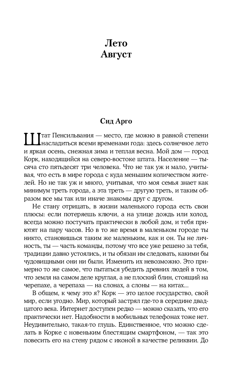 Меня зовут Сид Арго. Мой дом – город Корк, один из самых консервативных и религиозных в штате Пенсильвания. У нас есть своеобразная Библия (её называют Уставом), открыв которую, на первых ста пятидесяти страницах вы увидите свод правил, включающий обязательность молитв, служб и запреты. Запреты на всё. Нельзя громко говорить на улице. Нельзя нарушать комендантский час. Нельзя пропускать религиозные собрания. Нельзя. Нельзя. Нельзя. Ничего нельзя, кроме тайного ощущения собственной ничтожности…