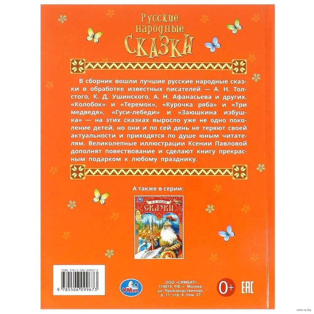 В сборник вошли лучшие русские народные сказки в обработке известных писателей – А. Н. Толстого, К. Д. Ушинского, А. Н. Афанасьева и других. "Колобок" и "Теремок", "Курочка ряба" и "Три медведя", "Гуси-лебеди" и "Заюшкина избушка" – на этих сказках выросло уже не одно поколение детей, но они и по сей день не теряют своей актуальности и приходятся по душе юным читателям. Великолепные иллюстрации Ксении Павловой дополнят повествование и сделают книгу прекрасным подарком к любому празднику.