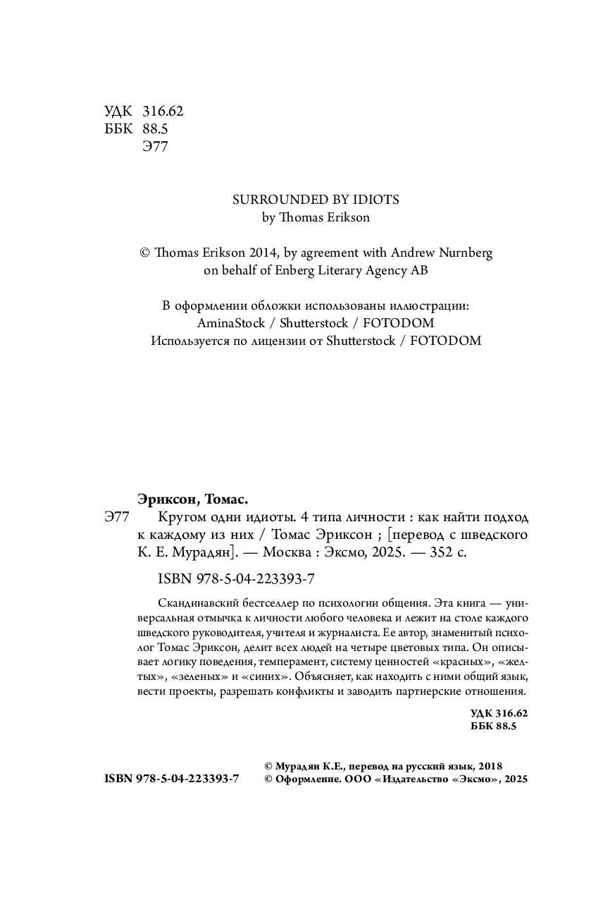 Скандинавский бестселлер по психологии общения. Эта книга – универсальная отмычка к личности любого человека и лежит на столе каждого шведского руководителя, учителя и журналиста. Ее автор, знаменитый психолог Томас Эриксон, делит всех людей на четыре цветовых типа. Он описывает логику поведения, темперамент, систему ценностей "красных", "желтых", "зеленых" и "синих". Объясняет, как находить с ними общий язык, вести проекты, разрешать конфликты и заводить партнерские отношения.