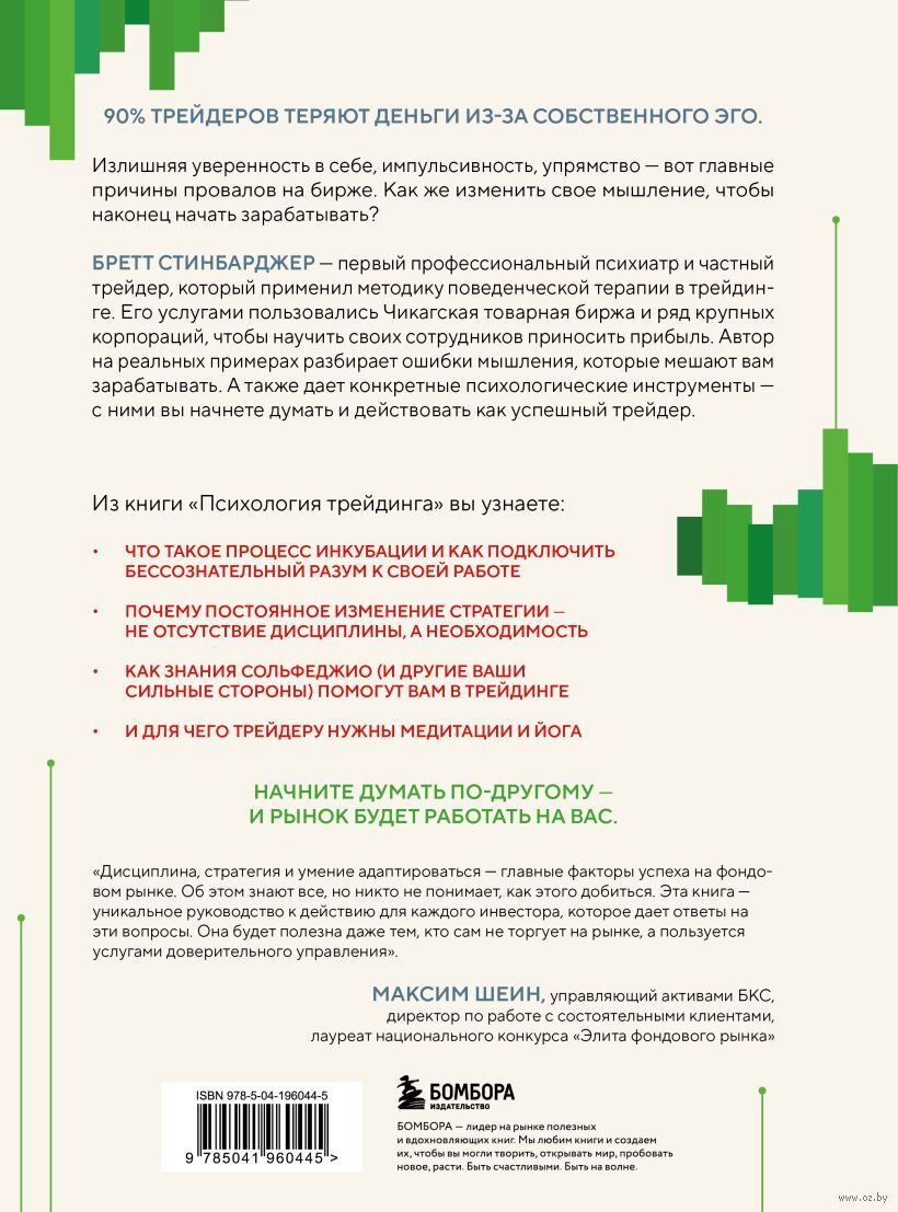 Бретт Стинбарджер – первый профессиональный психиатр и частный трейдер, который применил методики поведенческой терапии в трейдинге. Его услугами пользовались Чикагская товарная биржа и ряд крупных корпораций, чтобы научить своих сотрудников приносить прибыль. Автор на реальных примерах разбирает ошибки мышления, которые мешают вам зарабатывать. А также дает конкретные психологические инструменты – с ними вы начнете думать и действовать как успешный трейдер.
