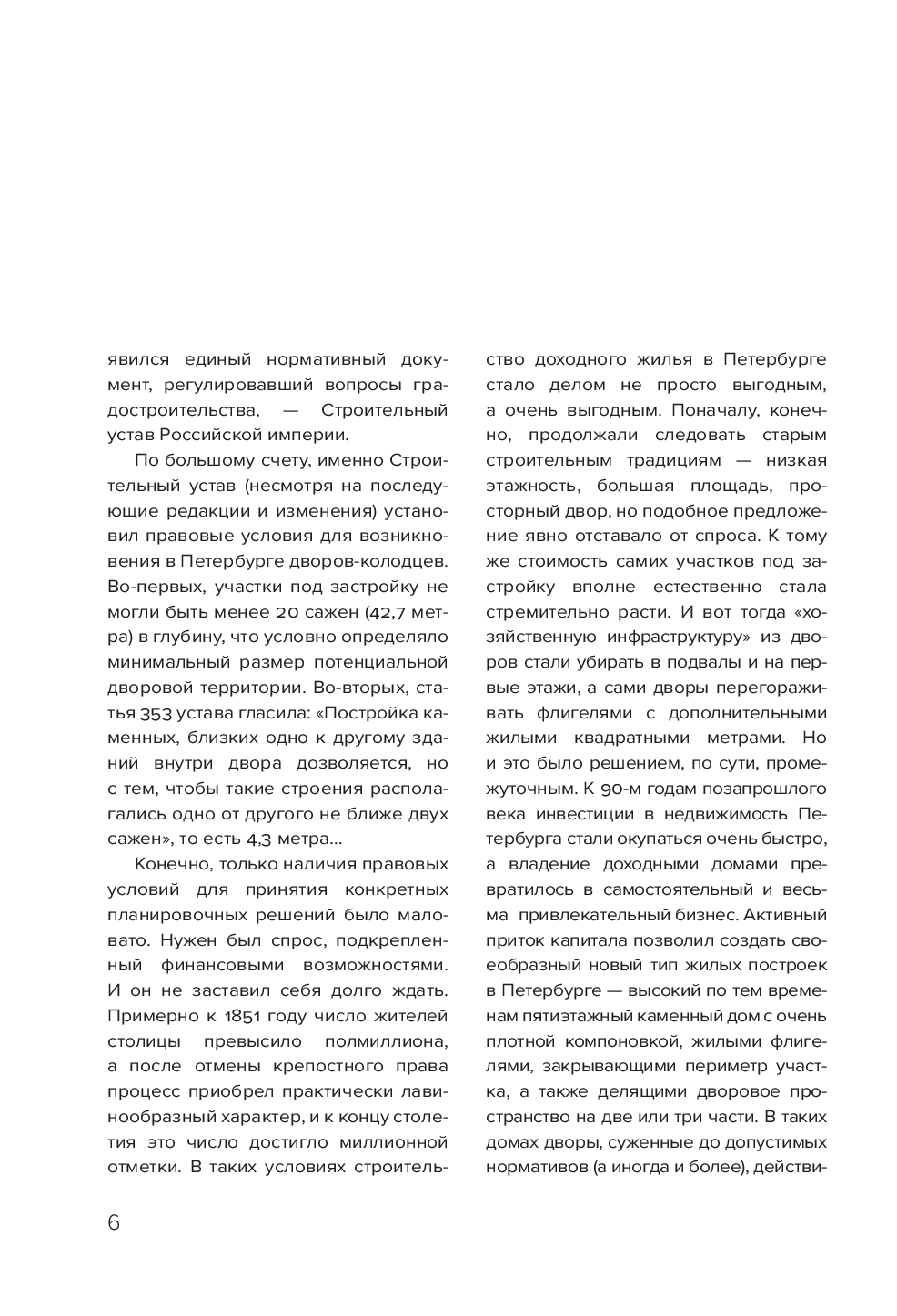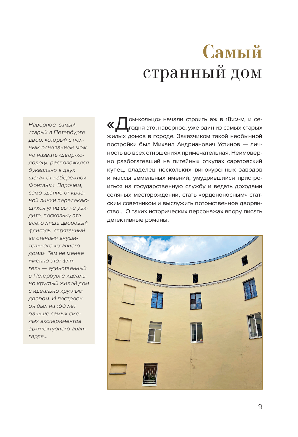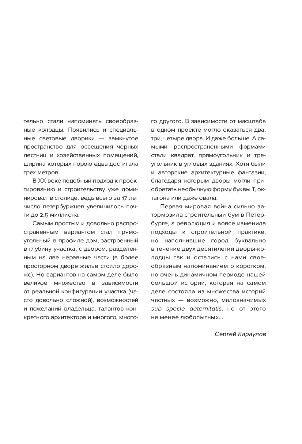 Автор книги, Сергей Караулов, задумал ее как продолжение истории о доходных домах, но дополнил рассказ фотопортретами и занимательной информацией о дворах, которые тоже были свидетелями многих событий. Новая книга соединила в себе прошлое и настоящее: от времен монументального ампира до лихорадки строительного бума начала XX века.