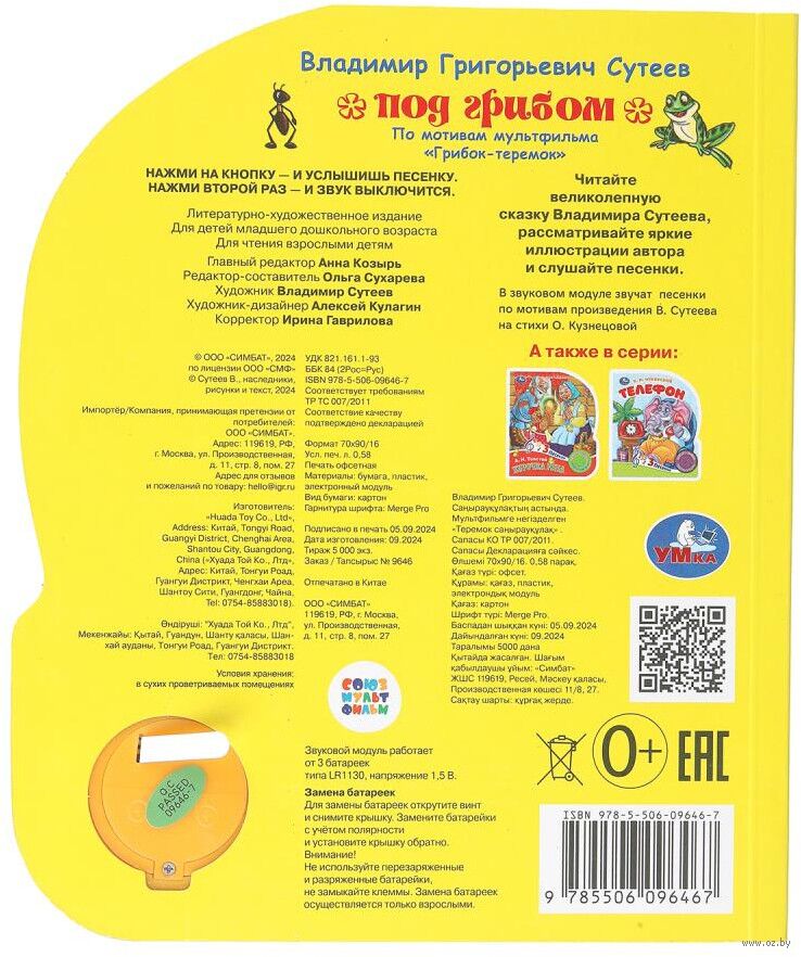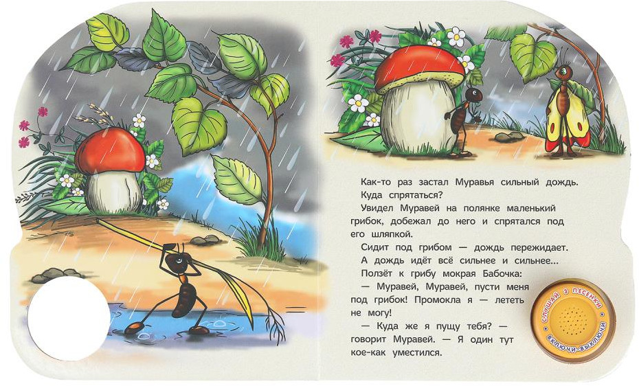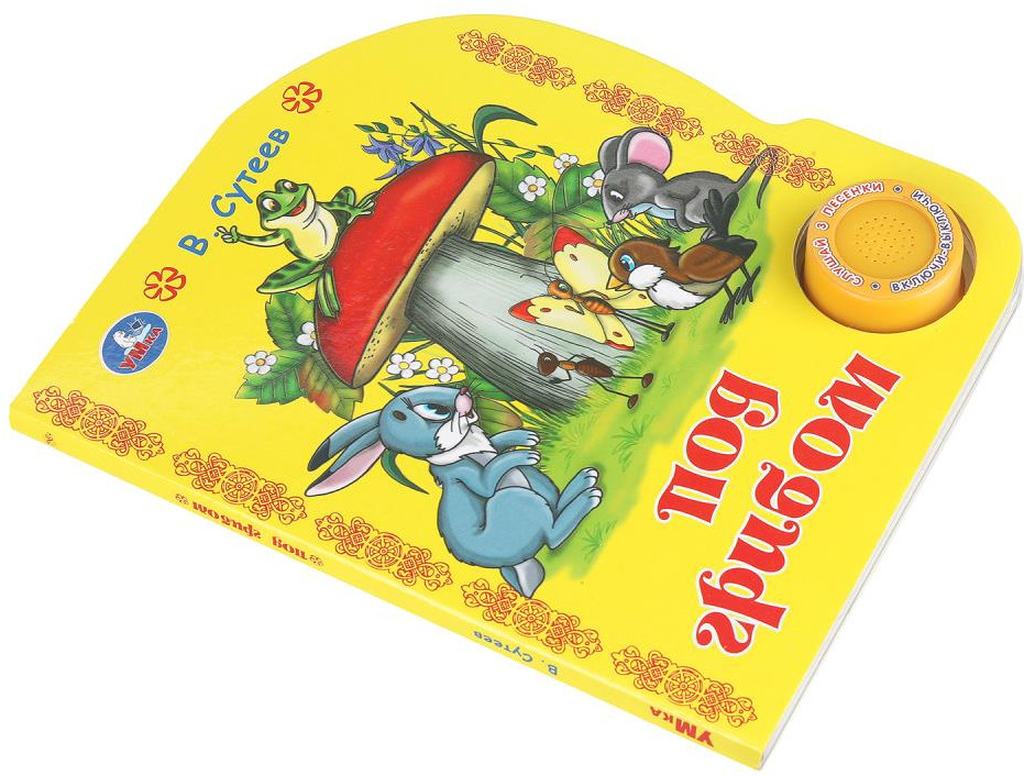 Музыкальная книга "В. Сутеев. Под грибом" станет прекрасным подарком для малыша. Ребёнок с удовольствием будет листать плотные страницы, рассматривать красочные картинки, вместе с родителями читать известную сказку и, конечно, нажимать на кнопку и слушать мелодичные песенки. Малыш легко освоит включение звука: по нажатию на кнопку песенка включится, при втором нажатии выключится, при третьем – заиграет следующая композиция. Благодаря компактному размеру книгу удобно взять с собой в дорогу.