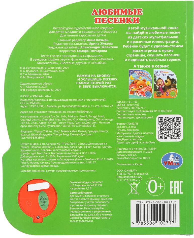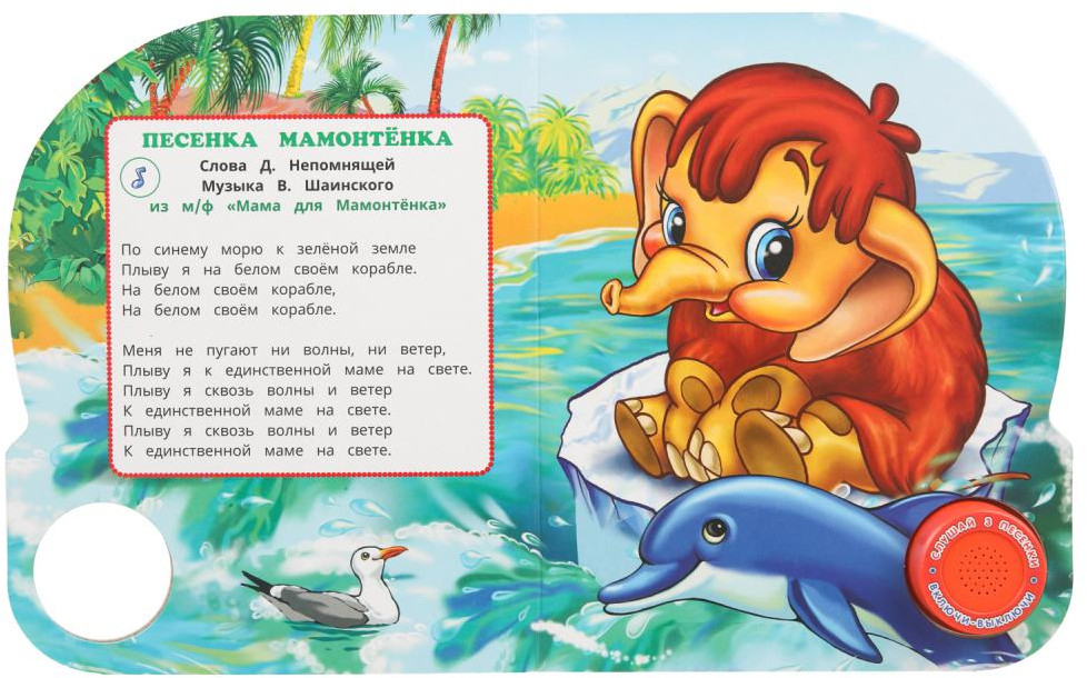 Музыкальная книга "Союзмультфильм. Любимые песенки" станет прекрасным подарком для малыша. Ребёнок с удовольствием будет листать плотные страницы, рассматривать яркие картинки и, конечно, нажимать на кнопку и слушать песенки из известных детских мультфильмов. Малыш легко освоит включение звука: по нажатию на кнопку песенка включится, при втором нажатии выключится, при третьем – заиграет следующая композиция. Благодаря удобному формату книгу можно взять с собой в путешествие.