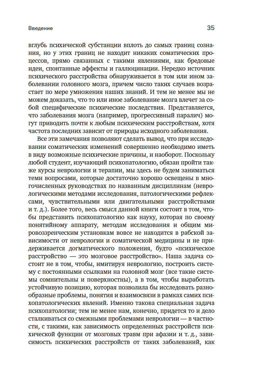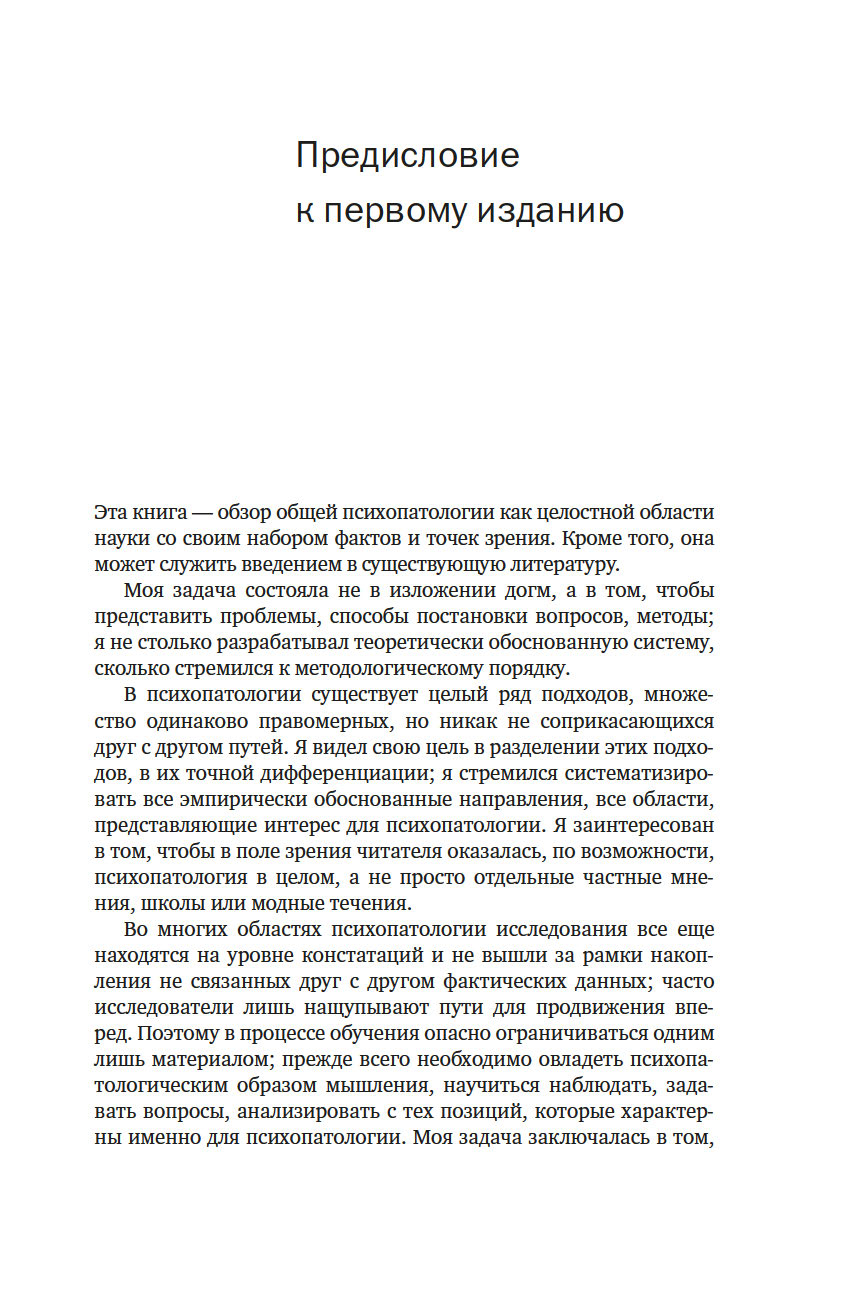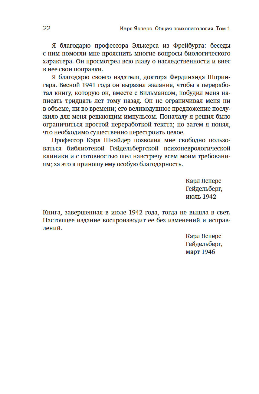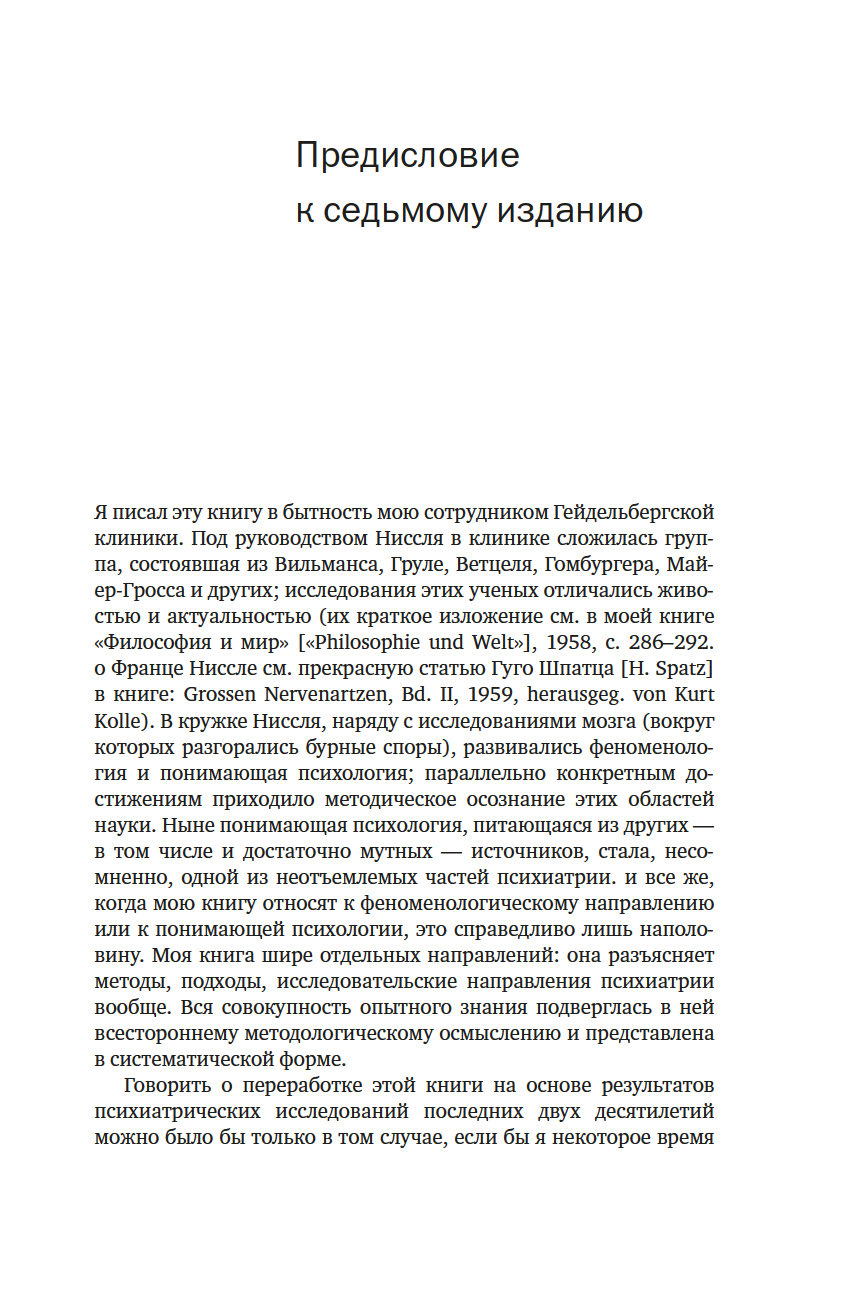 Первое издание "Общей психопатологии" вышло в 1913 году, когда Ясперсу было 30 лет; книга стала делом его жизни, при каждом переиздании он перерабатывал и расширял ее – вплоть до 1959 года, когда вышло 7-е издание. Это классика психиатрической литературы, настольная книга психиатров, которая, даже несмотря на интенсивное развитие наук о человеческом мозге и психике в последние десятилетия, остается незаменимой. Принятые сегодня диагностические критерии, как и классификация психических расстройств, по-прежнему основываются на идеях и методах, изложенных в этой работе.