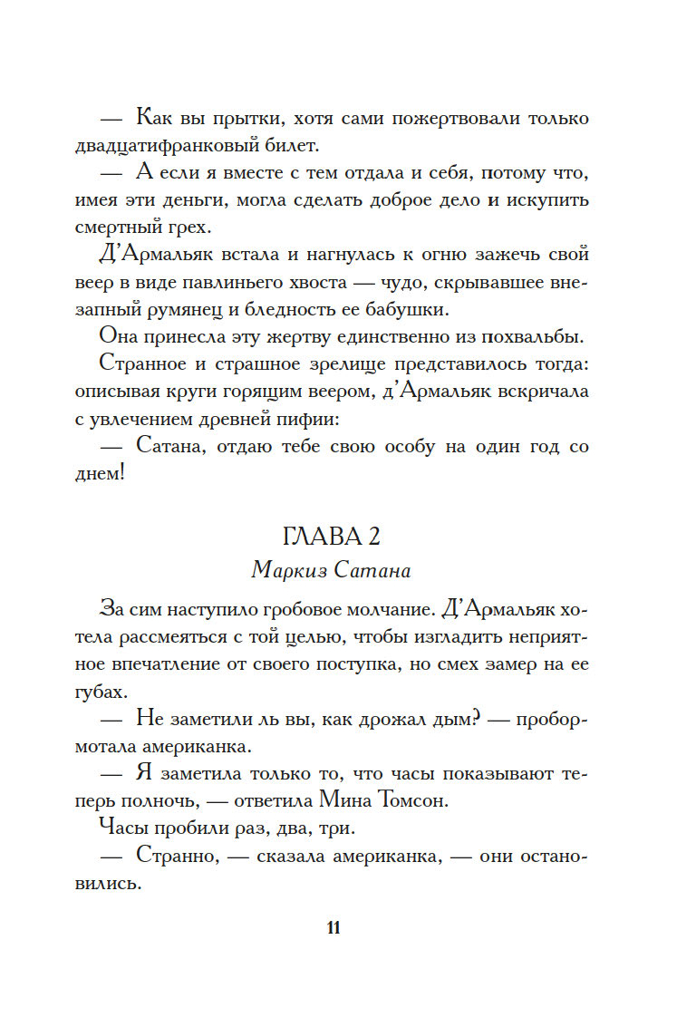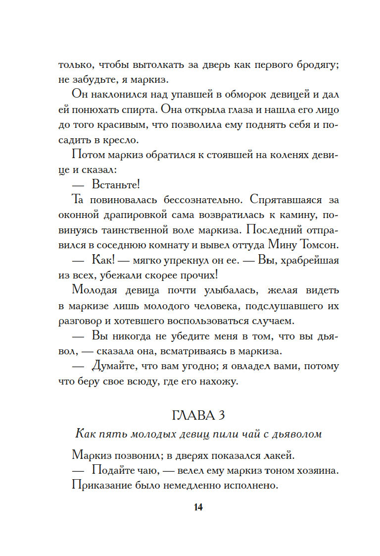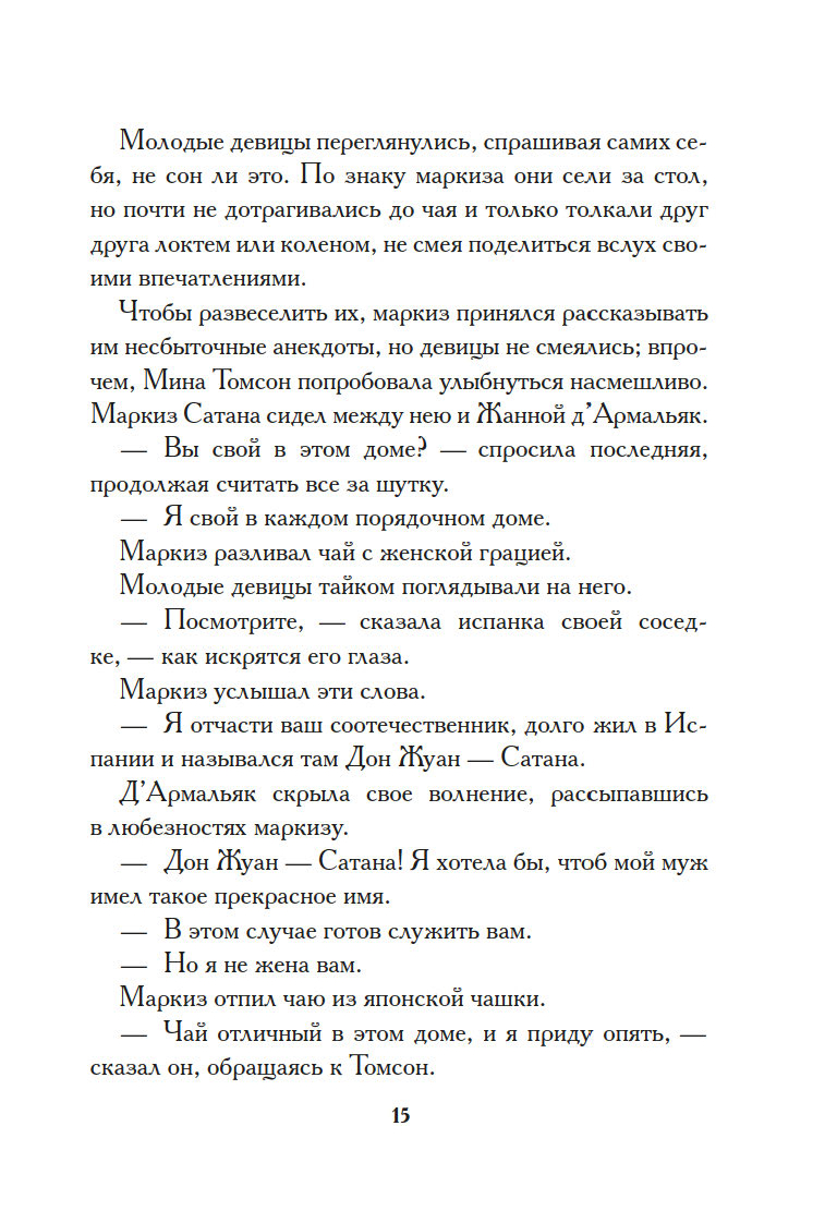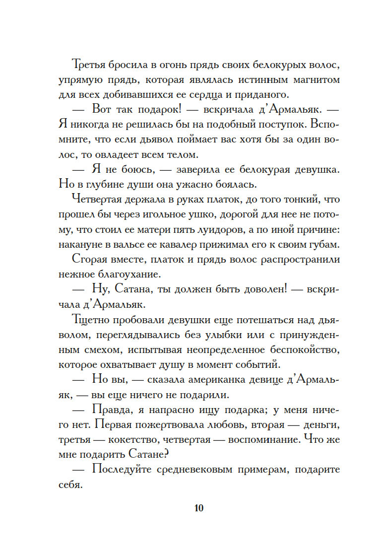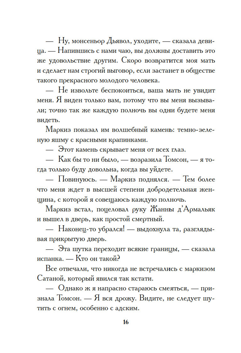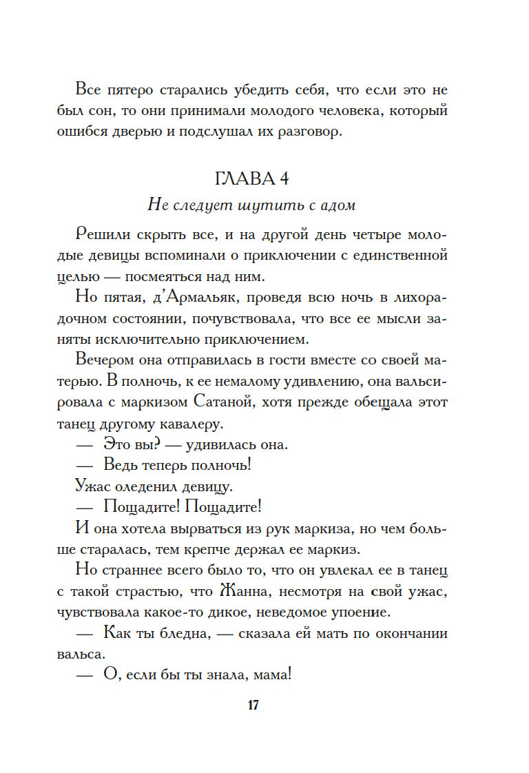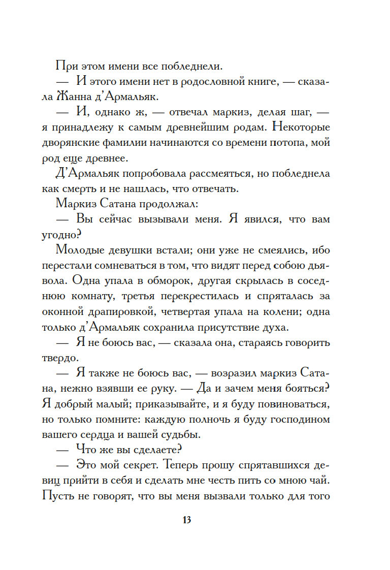 Поздним вечером, заскучав, пять сумасбродных светских девиц решили выпить чаю в обществе… самого Сатаны. Дьявол не явился на их ритуальный призыв, и тогда самая отчаянная из собравшихся, Жанна д’Армальяк, предложила нечистому… себя самое. Тут же слуга возвестил о прибытии маркиза Сатаны. Невероятный красавец, он выпил чашку чая в компании перепуганных девиц и удалился, пообещав Жанне, что каждую полночь станет являться к ней. Нетрудно догадаться, обещание свое маркиз выполнил, и даже перевыполнил, влюбившись во вздорную красавицу…