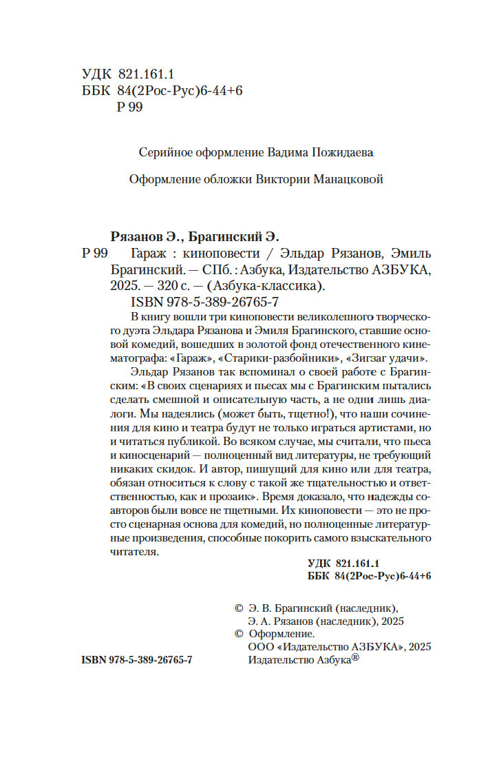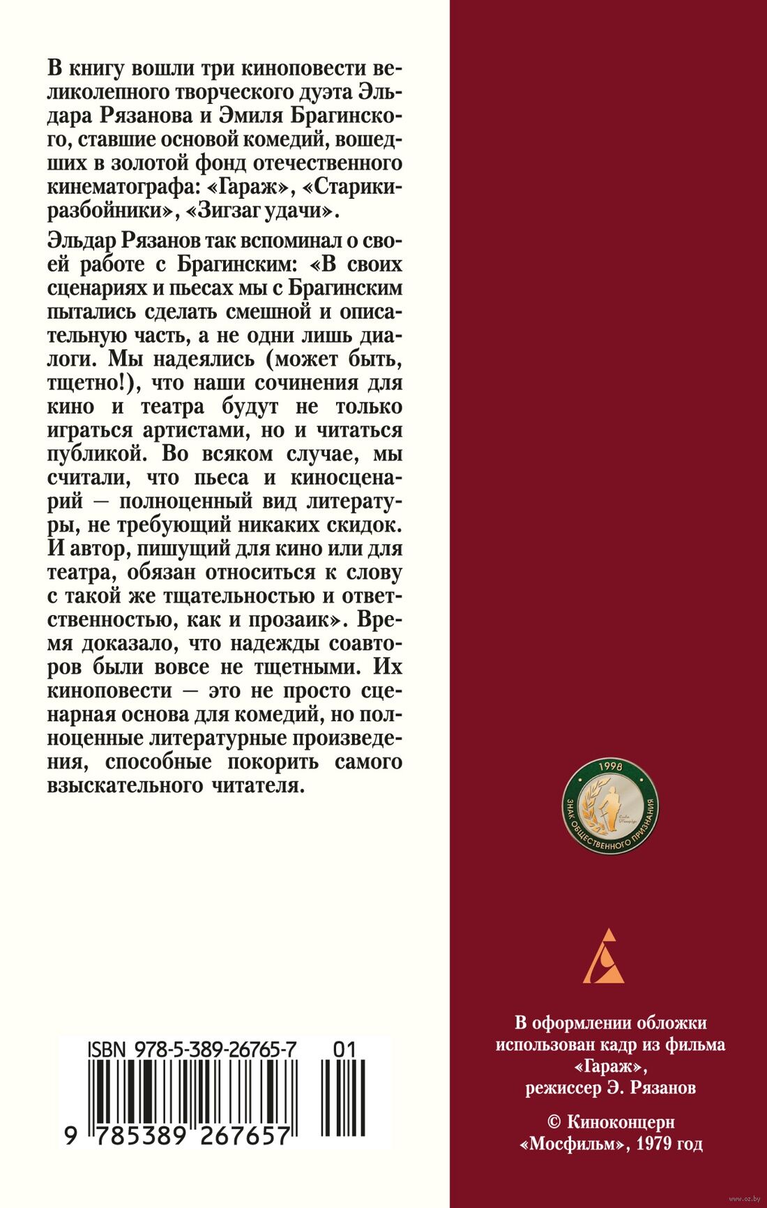 В книгу вошли три киноповести великолепного творческого дуэта Эльдара Рязанова и Эмиля Брагинского, ставшие основой комедий, вошедших в золотой фонд отечественного кинематографа: "Гараж", "Старики-разбойники", "Зигзаг удачи".