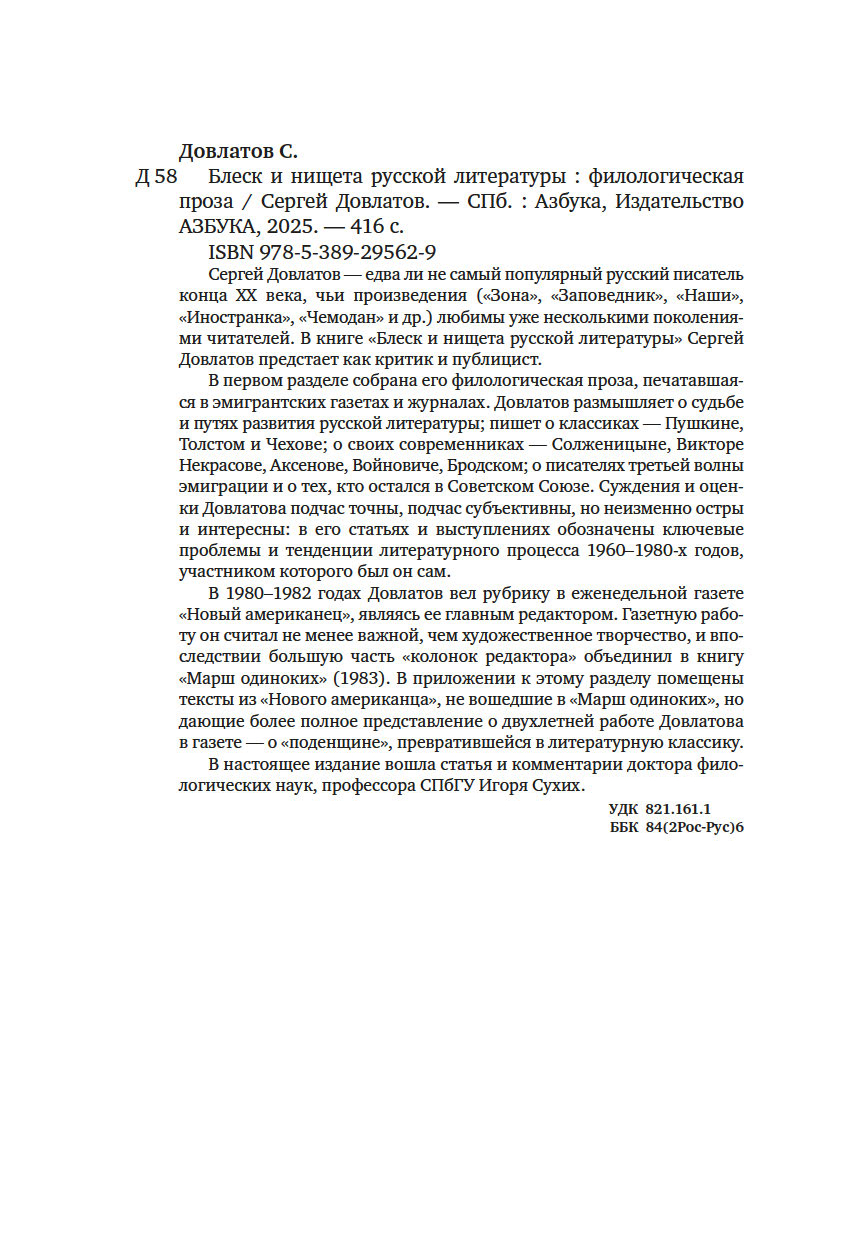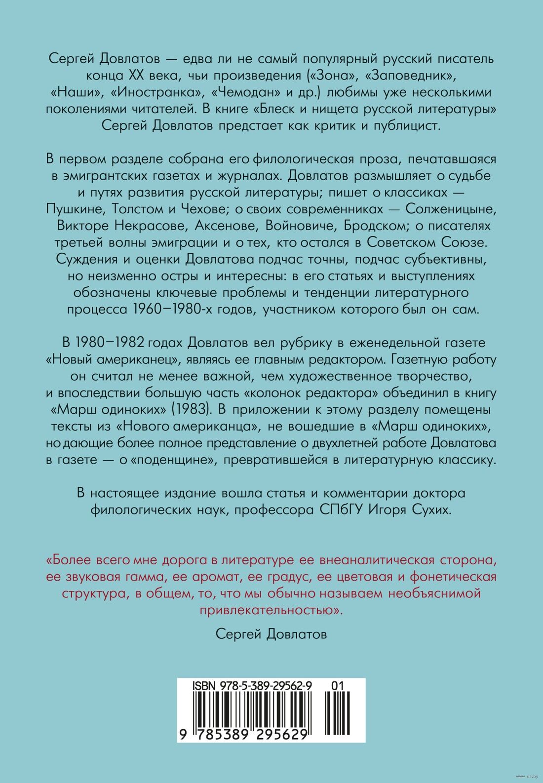 Сергей Довлатов – едва ли не самый популярный русский писатель конца ХХ века, чьи произведения ("Зона", "Заповедник", "Наши", "Иностранка", "Чемодан" и др.) любимы уже несколькими поколениями читателей. В книге "Блеск и нищета русской литературы" Сергей Довлатов предстает как критик и публицист.