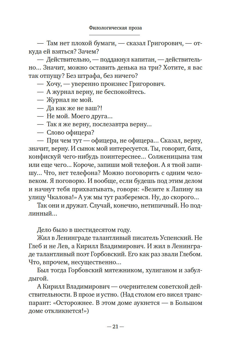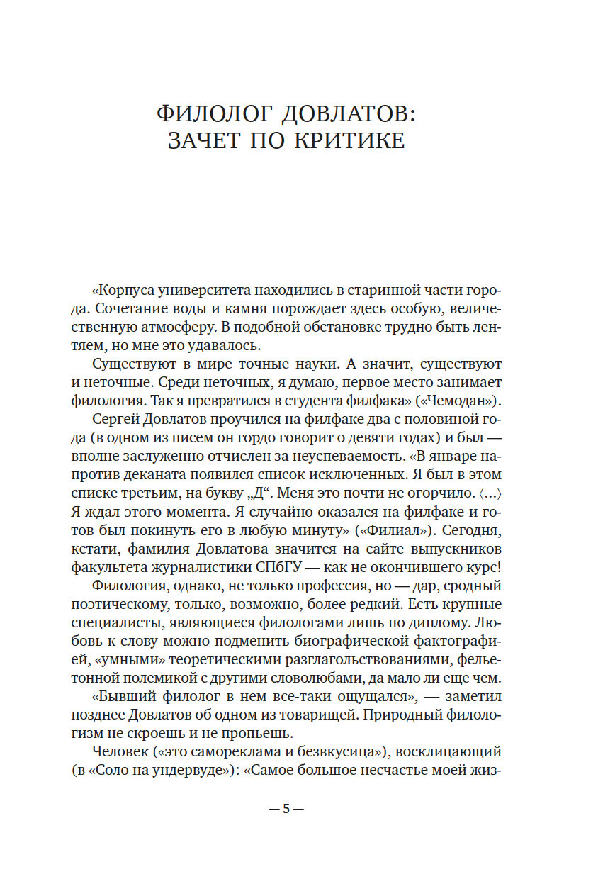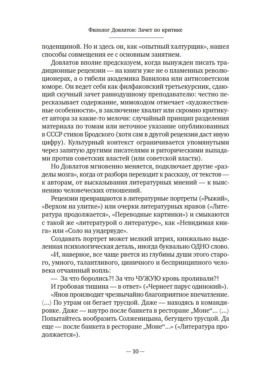 В первом разделе собрана его филологическая проза, печатавшаяся в эмигрантских газетах и журналах. Довлатов размышляет о судьбе и путях развития русской литературы; пишет о классиках – Пушкине, Толстом и Чехове; о своих современниках – Солженицыне, Викторе Некрасове, Аксенове, Войновиче, Бродском; о писателях третьей волны эмиграции и о тех, кто остался в Советском Союзе. Суждения и оценки Довлатова подчас точны, подчас субъективны, но неизменно остры и интересны: в его статьях и выступлениях обозначены ключевые проблемы и тенденции литературного процесса 1960–1980-х годов, участником которого был он сам.
