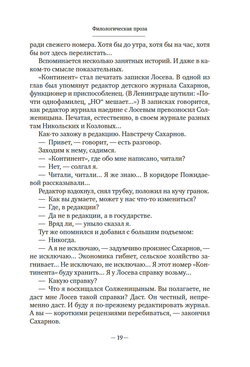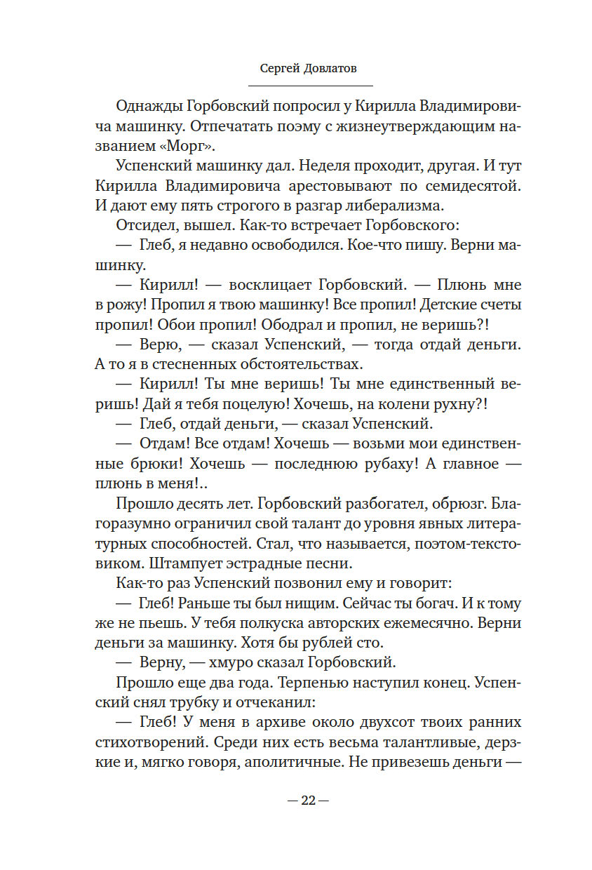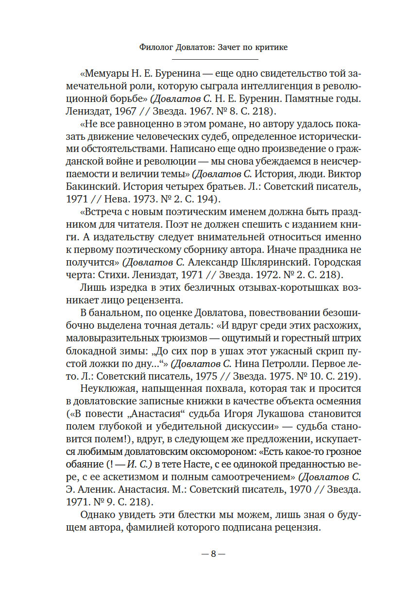 В первом разделе собрана его филологическая проза, печатавшаяся в эмигрантских газетах и журналах. Довлатов размышляет о судьбе и путях развития русской литературы; пишет о классиках – Пушкине, Толстом и Чехове; о своих современниках – Солженицыне, Викторе Некрасове, Аксенове, Войновиче, Бродском; о писателях третьей волны эмиграции и о тех, кто остался в Советском Союзе. Суждения и оценки Довлатова подчас точны, подчас субъективны, но неизменно остры и интересны: в его статьях и выступлениях обозначены ключевые проблемы и тенденции литературного процесса 1960–1980-х годов, участником которого был он сам.