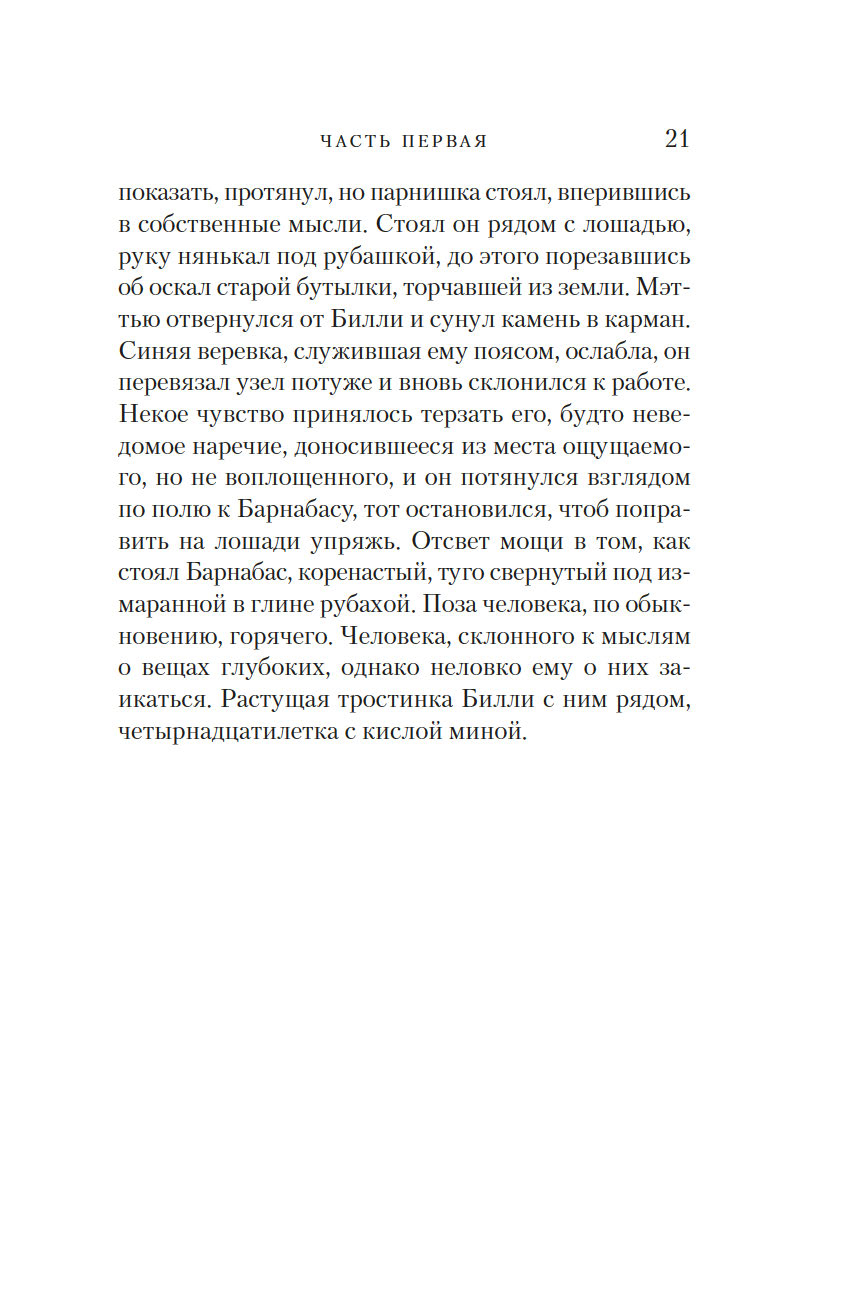 "Черный снег" – это "блестящая, гипнотическая книга" (Филипп Майер, автор романа "Сын"), рядом с которой "большая часть современной прозы ощутимо меркнет" (National Public Radio). Весной 1945-го Мэттью Пиплз вбегает в охваченный пожаром хлев, чтобы вывести запертый там скот, – и погибает. Хозяин фермы Барнабас Кейн, сокрушенный смертью друга, пытается восстанавливать хозяйство, но его жена Эскра задыхается от неуверенности в завтрашнем дне, а сын Билли тяготится под гнетом страшной тайны…