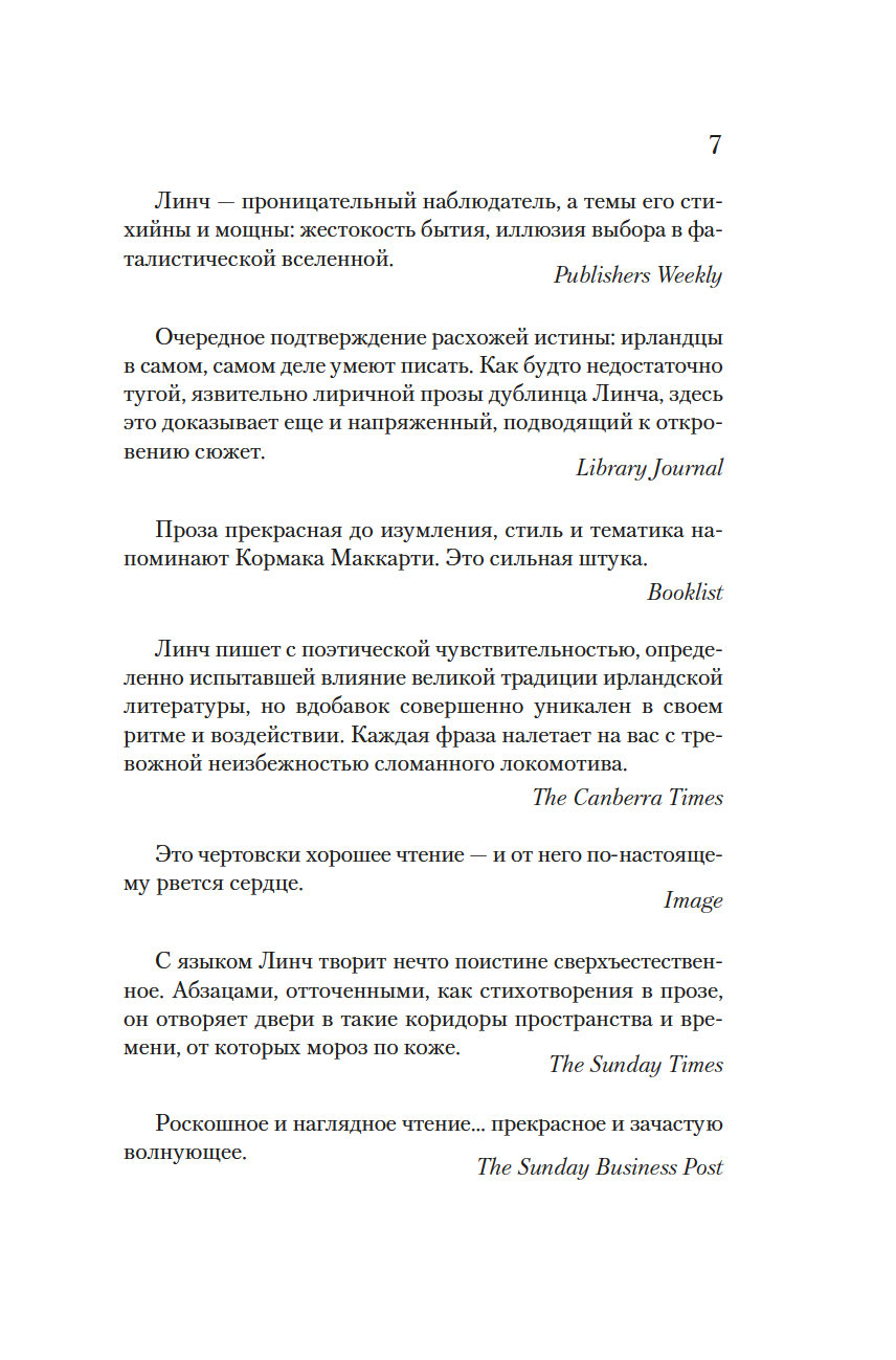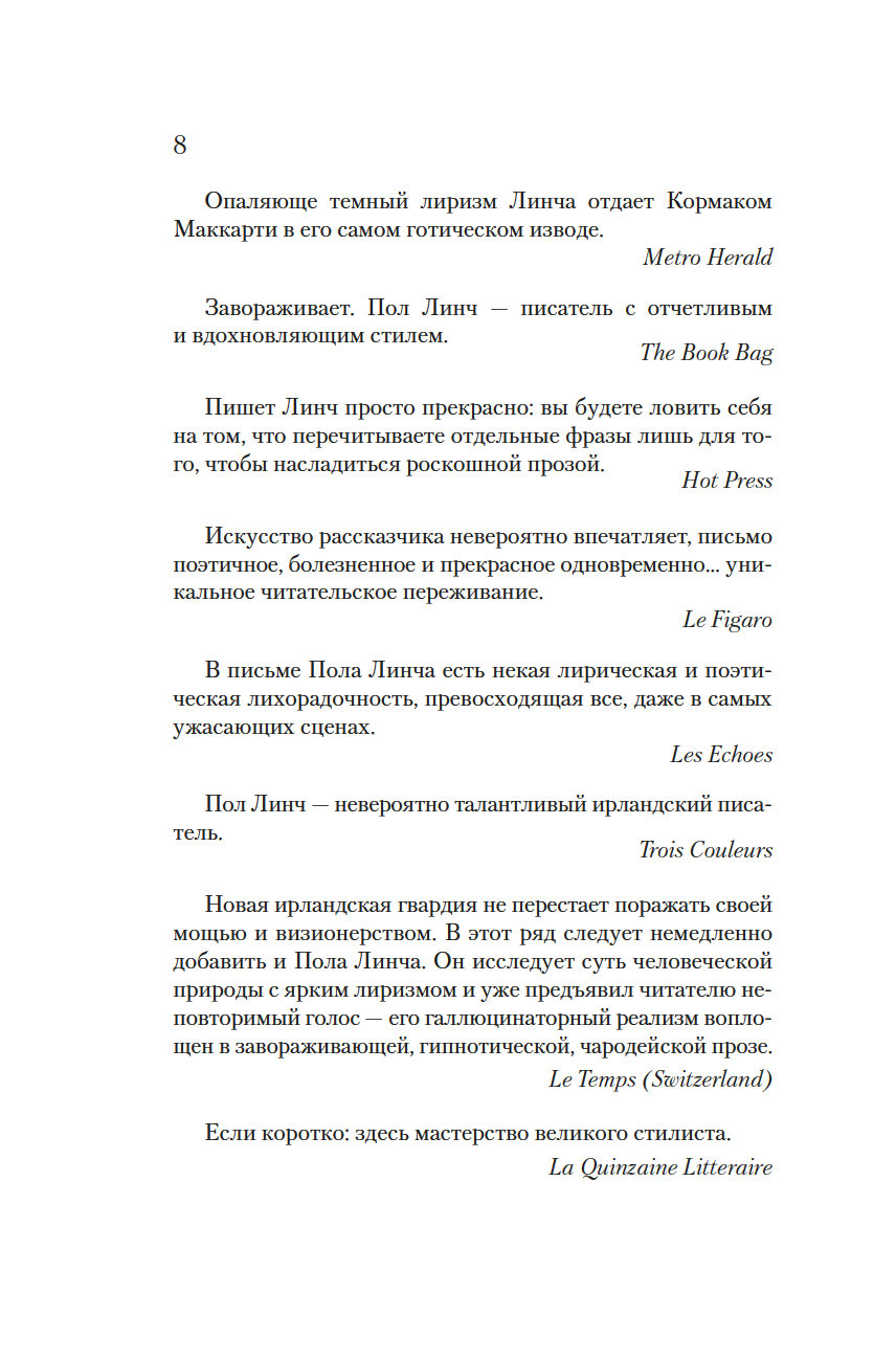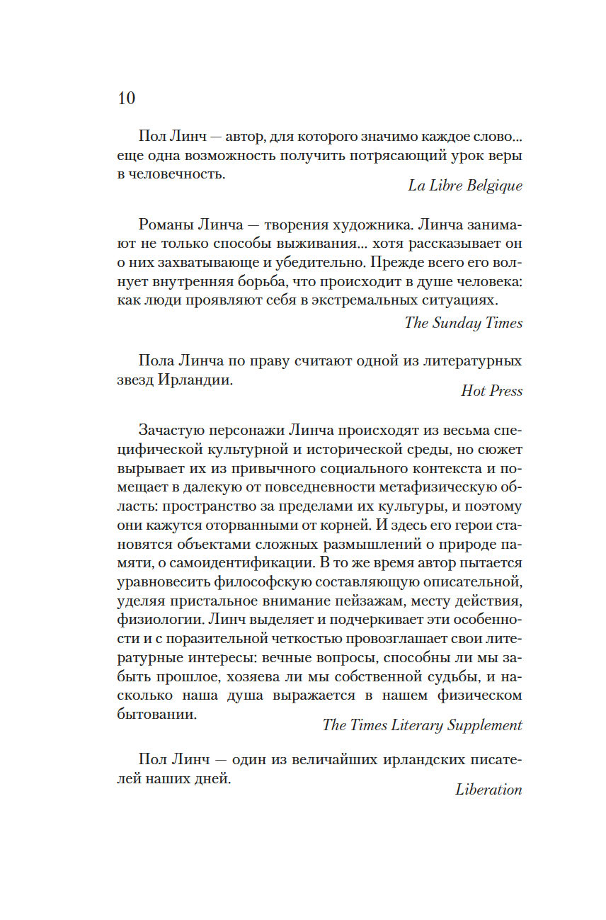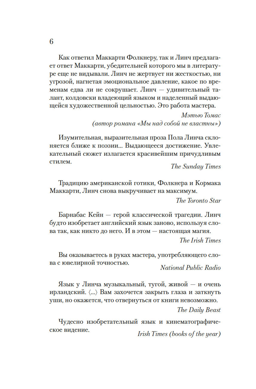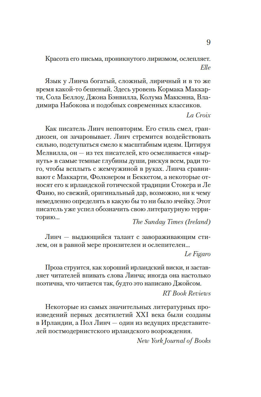 Впервые на русском – экзистенциальная пастораль современного ирландского классика Пола Линча, лауреата Букеровской премии 2023 года за роман "Песнь пророка", который уже называют "ирландским "1984"" и "новым "Рассказом служанки"".