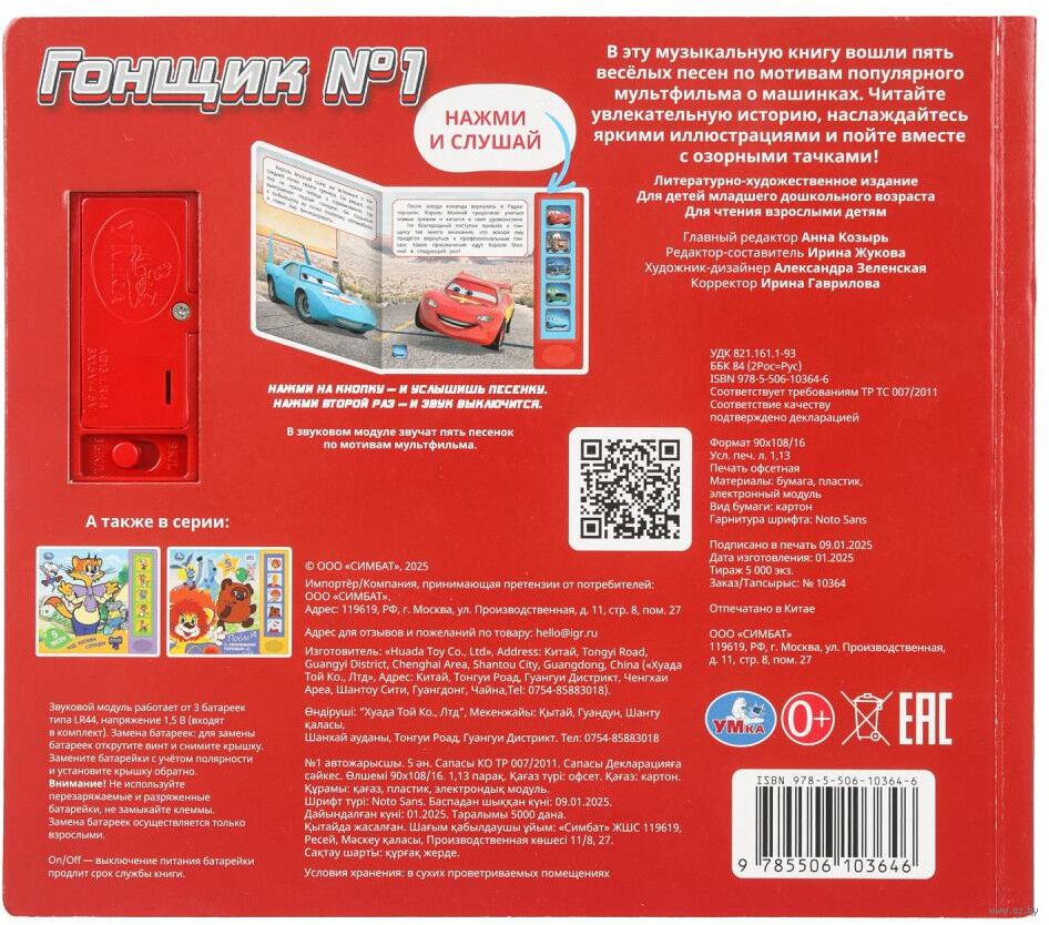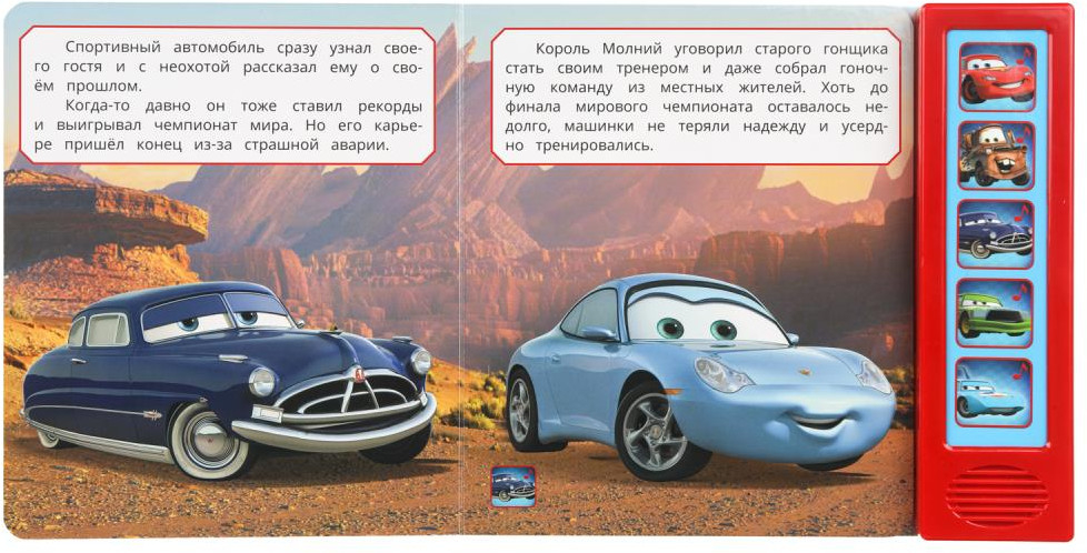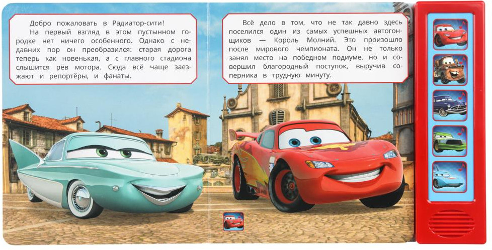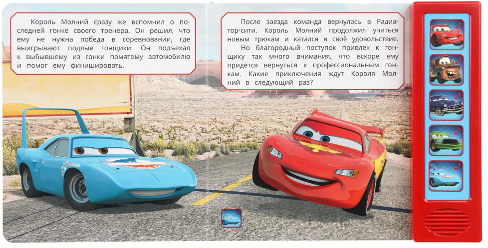 Музыкальная книга "Гонщик № 1" станет отличным подарком для маленького любознайки. Малыш с удовольствием будет листать плотные страницы, рассматривать яркие иллюстрации, нажимать на звуковые кнопки и слушать весёлые песенки по мотивам известного мультфильма. Он легко освоит включение звука: по нажатию на кнопку звук включится, при втором нажатии выключится и т.д.