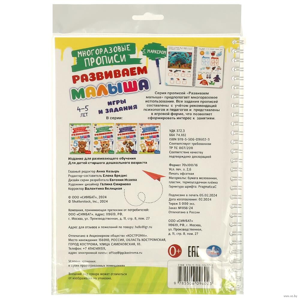 Многоразовые прописи с маркером "Игры и задания, для детей 4-5 лет" из серии "Развиваем малыша" – отличный тренажёр для развития графомоторных навыков: