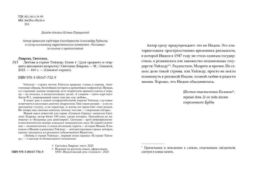 Новый цикл повестей для серии «Самокат-Сериал» написала Светлана Лаврова, автор более 100 книг, среди которых «Трилобиты не виноваты» и «Больница для динозавров». Светлана – врач-нейрофизиолог в онкологическом центре, кандидат медицинских наук. Её давнее увлечение – палеонтология, а самая последняя страсть – история Индии. В поездках в Индию и родилась Уайледу – несуществующая страна, которая, однако, находится на реальном субконтиненте Индостан…