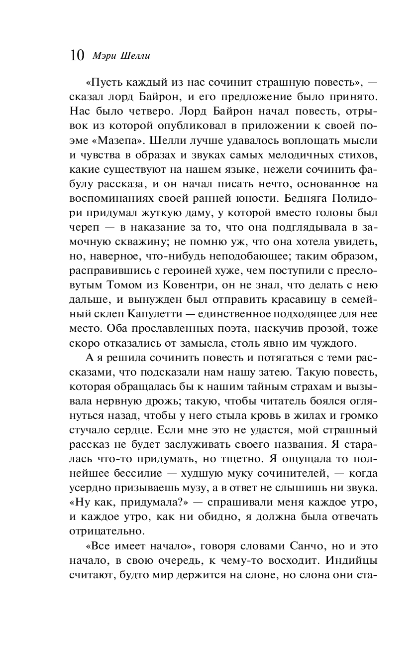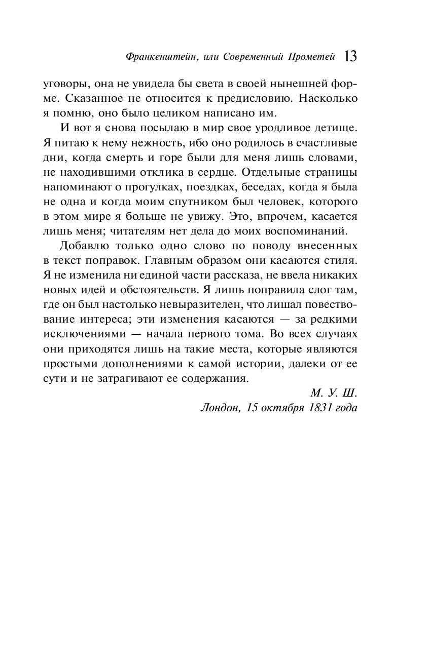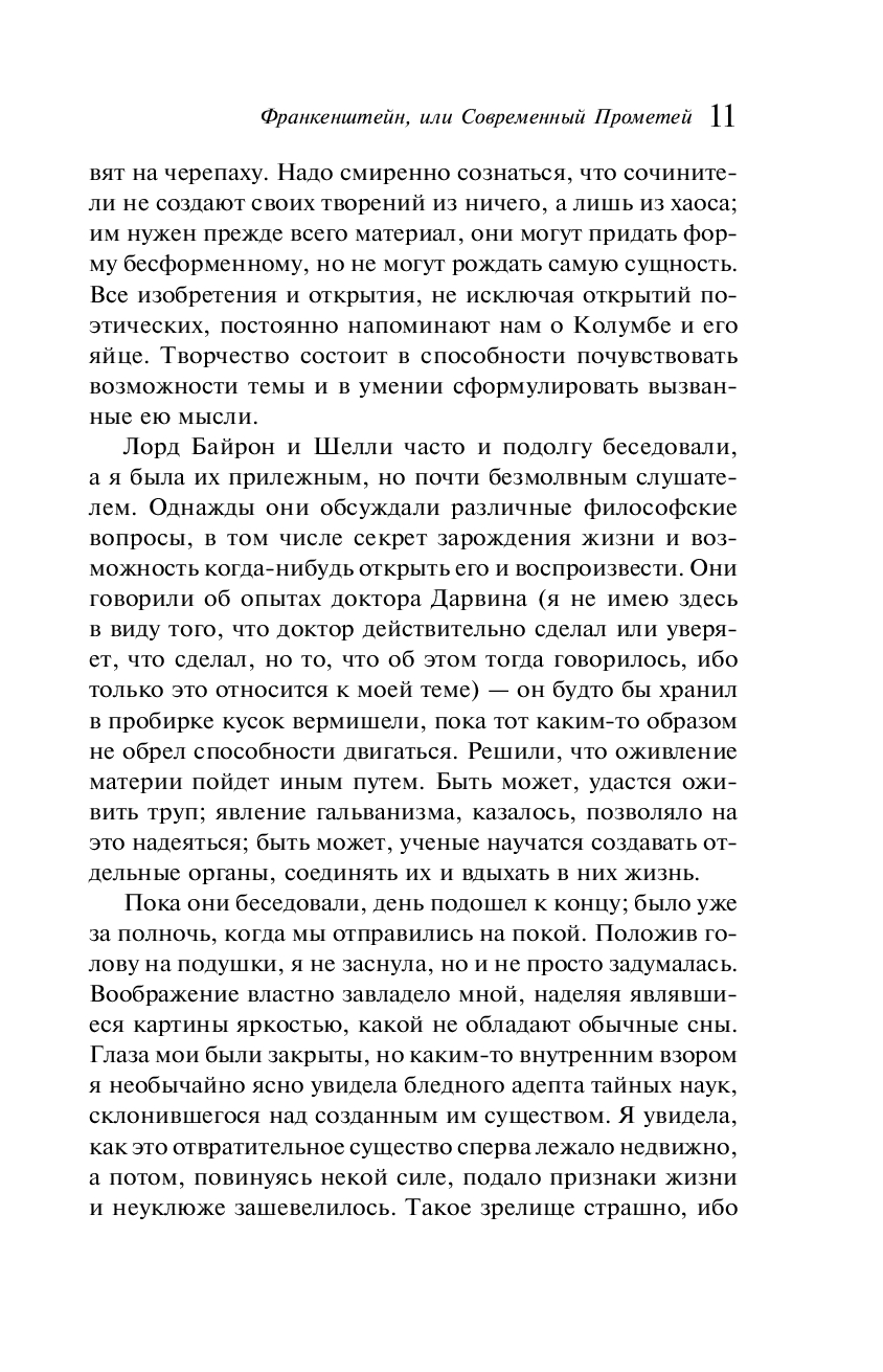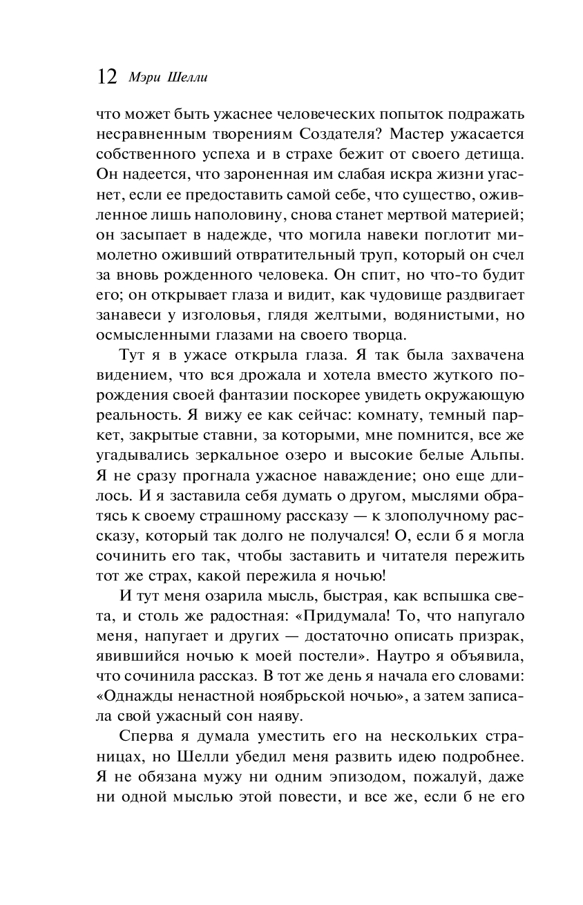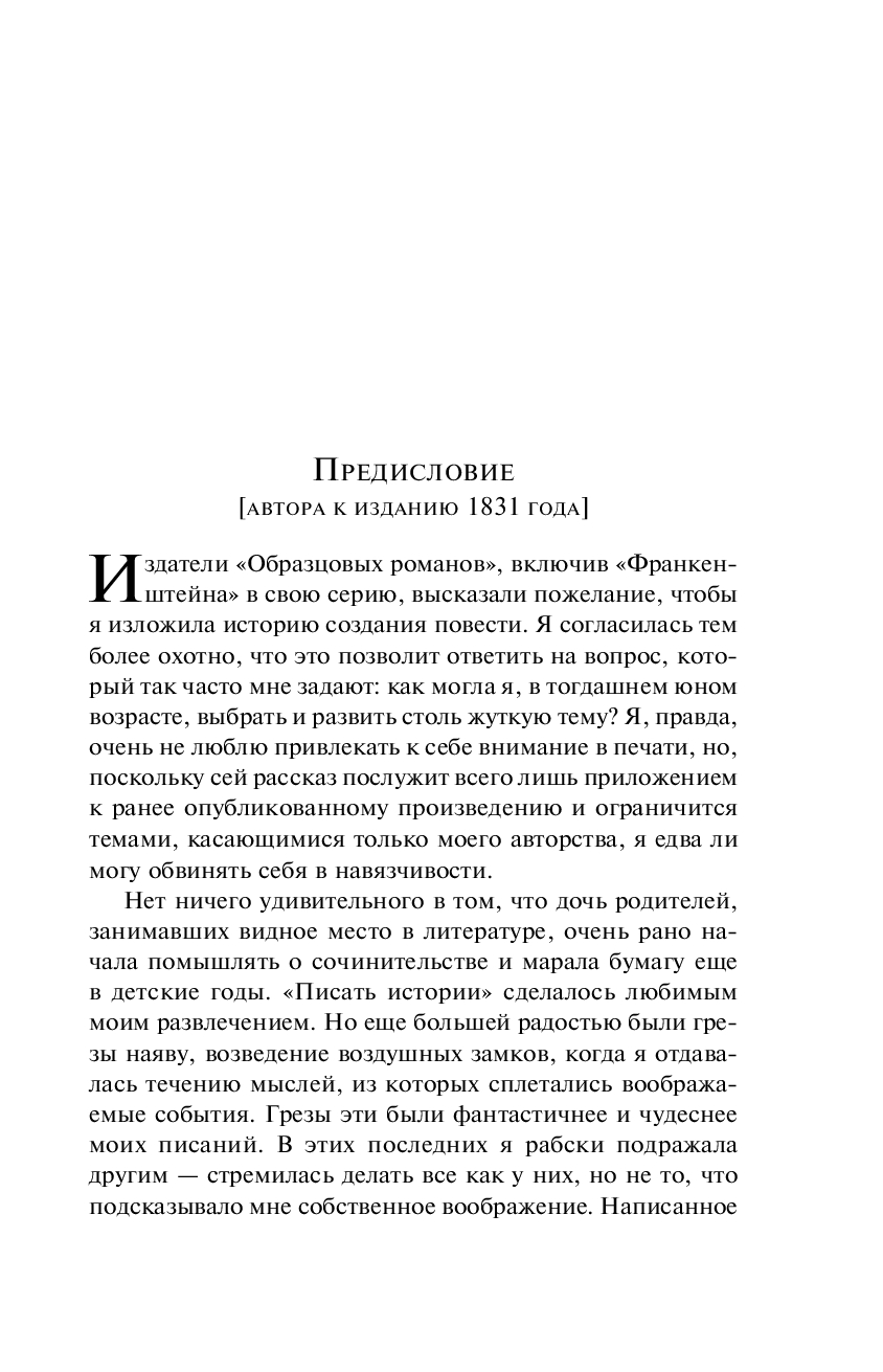 Замысел и первые эпизоды романа "Франкенштейн, или Современный Прометей" (1818) возникли как импровизация на заданную тему – сочинение страшных историй, инициированное лордом Байроном на швейцарской вилле Диодати летом 1816 года, а образ чудовища, сотворенного главным героем, явился автору – восемнадцатилетней англичанке Мэри Шелли – в ночном кошмаре. Однако, несмотря на юный возраст начинающей писательницы и почти случайные обстоятельства создания книги, "Франкенштейну" суждено было стать событием национальной и мировой литературы. Классика научно-фантастической прозы, шедевр романтической готики, оригинальный философский роман, источник знаковых образов современной культурной мифологии – таков далеко не полный ряд расхожих определений этого впечатляющего литературного дебюта. Трагический сюжет, придуманный автором, породил множество подражаний, переложений и продолжений – в художественной прозе, драматургии, театре и, разумеется, кинематографе.