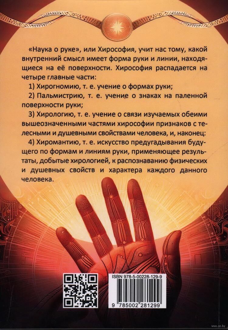 Он включает в себя сведения по хирогномии (учение о формах руки), пальмистрии (учение о знаках на ладони), хирологии (учение о связях двух предыдущих дисциплин с телесными и душевными свойствами человека) и по собственно хиромантии. Любители хиромантии – как начинающие, так и те, кто уже обладает определённой квалификацией – найдут в книге большое количество интересной информации, которая, возможно, заставит по-новому взглянуть на искусство гадания по руке.